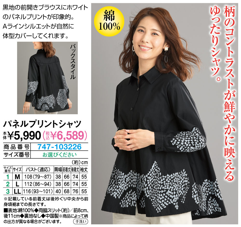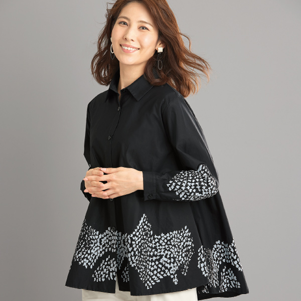 黒地の前開きブラウスにホワイトのパネルプリントが印象的。