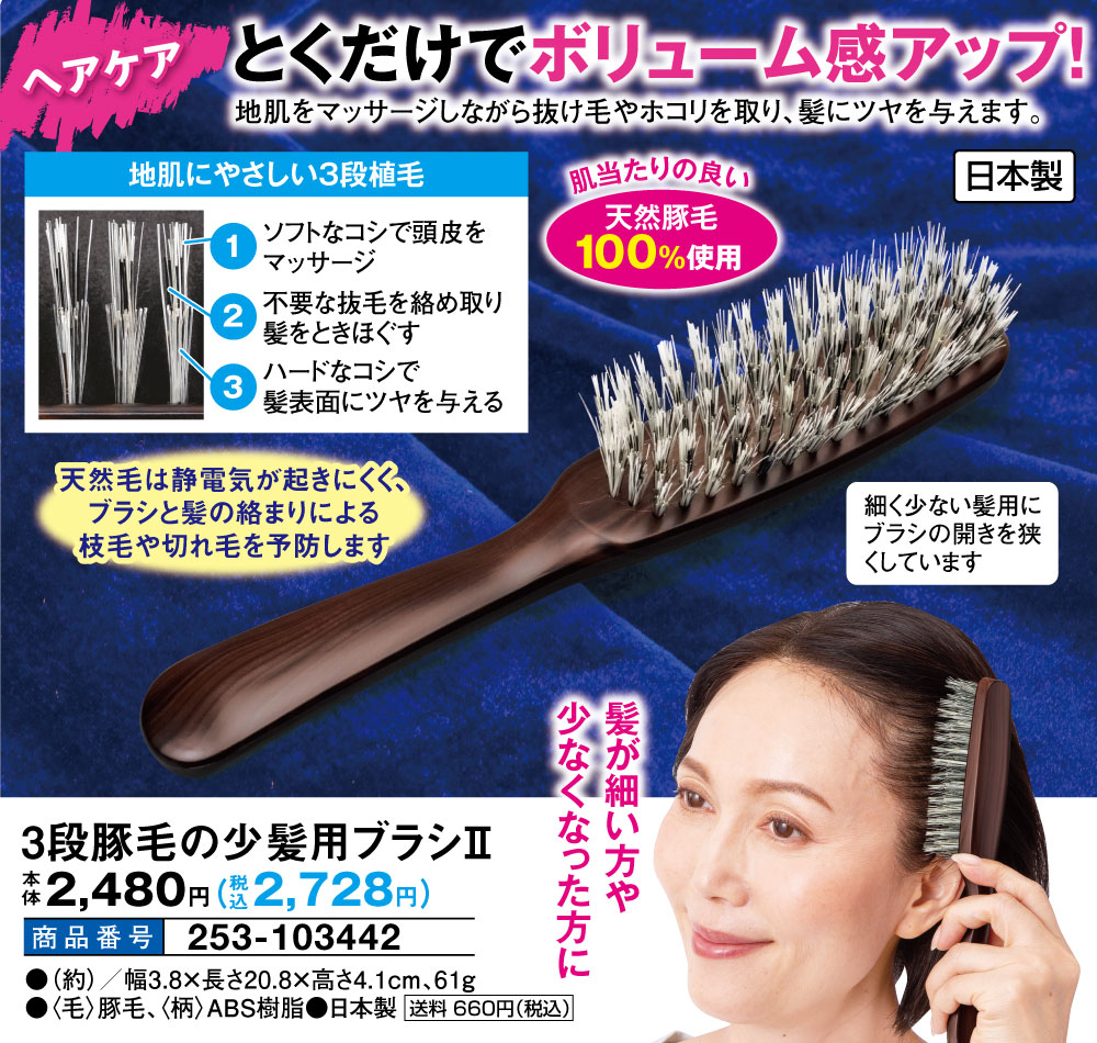 ◎天然豚毛ブラシでとくだけでボリューム感アップ! ◎髪が細くなった方や少なくなった方に! ◎天然豚毛100%使用 ◎天然毛は静電気が起きにくく、自身の油分により枝毛を予防します