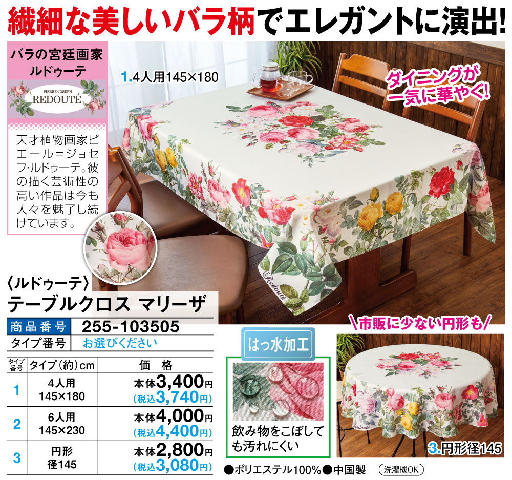 繊細な美しいバラ柄でエレガントに演出! ダイニングが一気に華やぐ! 市販に少ない円形も ・はっ水加工:飲み物をこぼしても汚れにくい 【バラの宮廷画家ルドゥーテ】 天才植物画家ピエール=ジョセフ・ルドゥーテ。彼の描く芸術性の高い作品は今も人々を魅了し続けています。