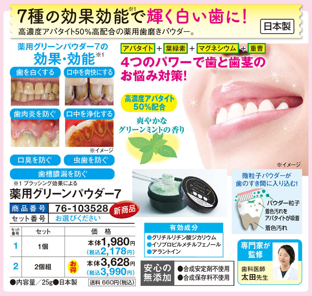 7種の効果効能※1で輝く白い歯に! 高濃度アパタイト50%高配合の薬用歯磨きパウダー。 アパタイト+葉緑素+マグネシウム+重曹 4つのパワーで歯と歯茎のお悩み対策! 薬用グリーンパウダー7の効果・効能※1 歯を白くする/口中を爽快にする/歯肉炎を防ぐ/口中を浄化する 口臭を防ぐ/虫歯を防ぐ/歯槽膿漏を防ぐ 微粒子パウダーが歯のすき間に入り込む! ●高濃度アパタイト50%配合 ●爽やかなグリーンミントの香り 【安心の無添加】 合成安定剤不使用、合成保存料不使用 【専門家が監修】 歯科医師 太田先生 ◆有効成分:グリチルリチン酸ジカリウム、イソプロピルメチルフェノール、アラントイン