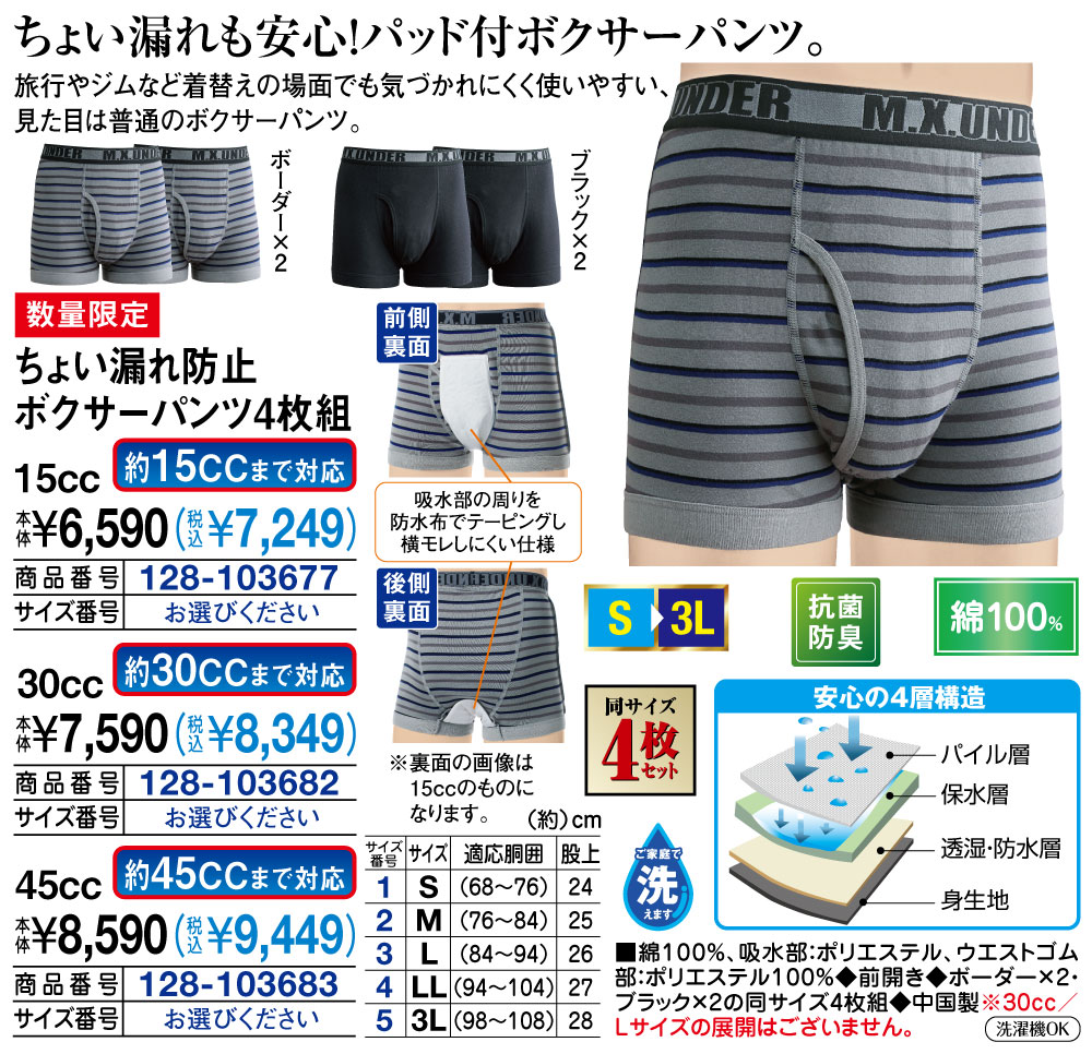 ちょい漏れも安心!パッド付ボクサーパンツ! 旅行やジムなど着替えの場面でも気づかれにくく使いやすい、見た目は普通のボクサーパンツ。 吸水部の周りを防水布でテーピングし横モレしにくい仕様 【安心の4層構造】 パイル層/保水層/透湿・防水層/身生地 ●抗菌防臭 ●S~3L ●同サイズ4枚セット