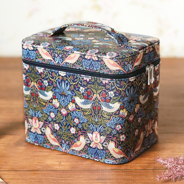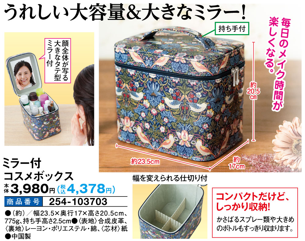 うれしい大容量&大きなミラー! ウィリアム・モリスのシックな「いちご泥棒」を全面にあしらったメイクボックス。 毎日のメイク時間が楽しくなる。 コンパクトだけど、しっかり収納! かさばるスプレー類や大きめのボトルもすっきり収まります。 顔全体が写る大きなタテ型ミラー付! 幅を変えられる仕切り付 シックな「いちご泥棒」柄 ●持ち手付