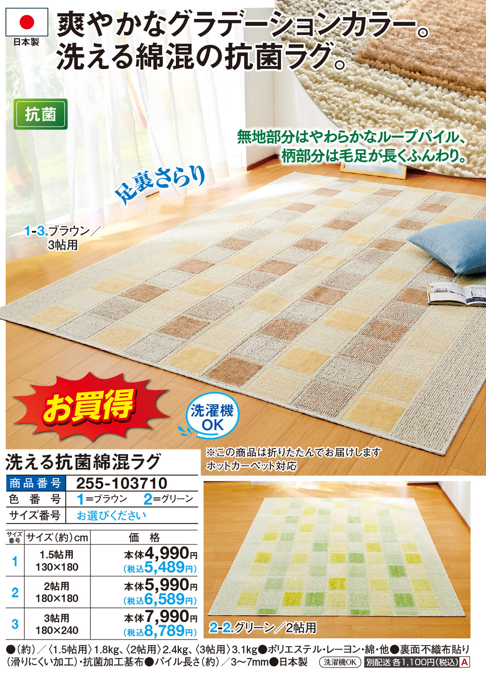 ●(約)/<1.5帖用>1.8kg、<2帖用>2.4kg、<3帖用>3.1kg ●ポリエステル・レーヨン・綿・他 ●裏面不織布貼り(滑りにくい加工)・抗菌加工基布 ●パイル長さ(約)/3~7mm ●日本製