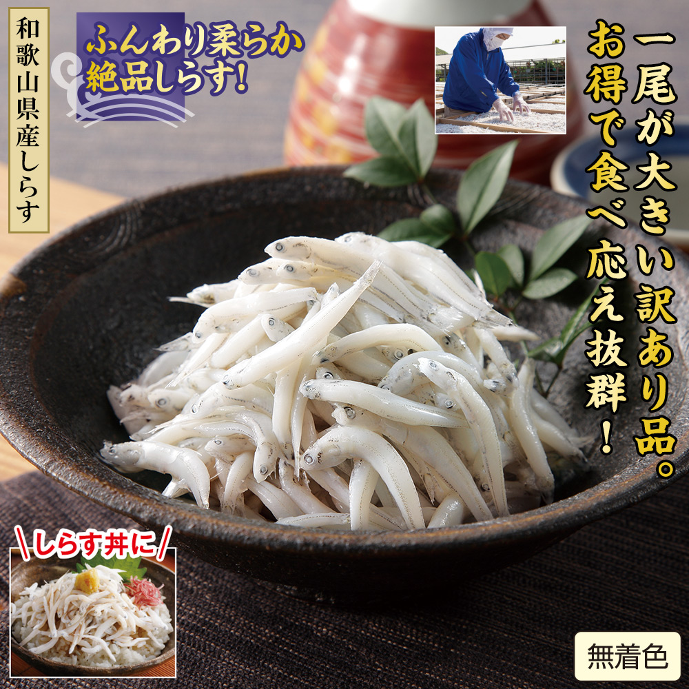 【和歌山県産しらす】 一尾が大きい訳あり品。お得で食べ応え抜群! 和歌山県湯浅湾近海で水揚げされたしらすを厚釜で踊らせるように茹で上げ、ふんわりとした食感に仕上げました。 茹で塩に赤穂の塩を使用し、しらす本来の食感を味わえるこだわりの一品です。 醤油やポン酢をかけてお召し上がりください。 食品添加物不使用 無着色