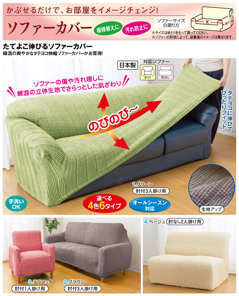 ●適応サイズ(約)/奥行85~90×高さ85cmまで(共通)、<肘付>1人掛け用:幅60~90cm、2人掛け用:幅90~140cm、3人掛け用:幅140~210cm、<肘なし>1人掛け用:幅50~80cm、2人掛け用:幅80~130cm、3人掛け用:幅130~190cm