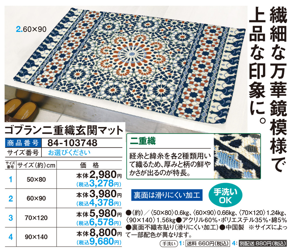●(約)/(50×80)0.6kg、(60×90)0.66kg、(70×120)1.24kg、(90×140)1.56kg ●アクリル60%・ポリエステル35%・綿5% ●裏面不織布貼り(滑りにくい加工) ●中国製