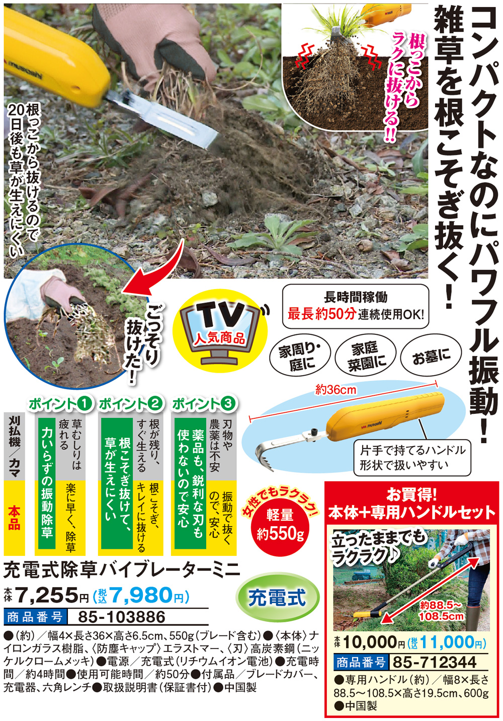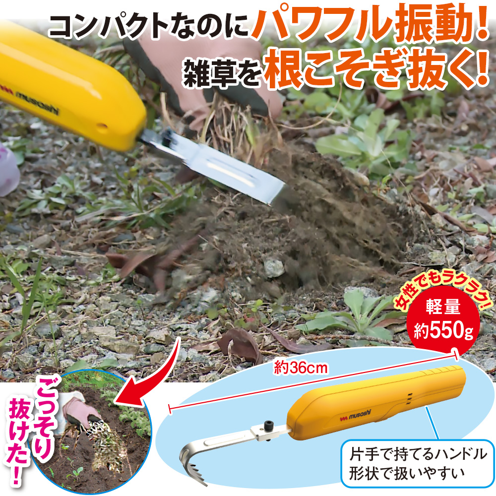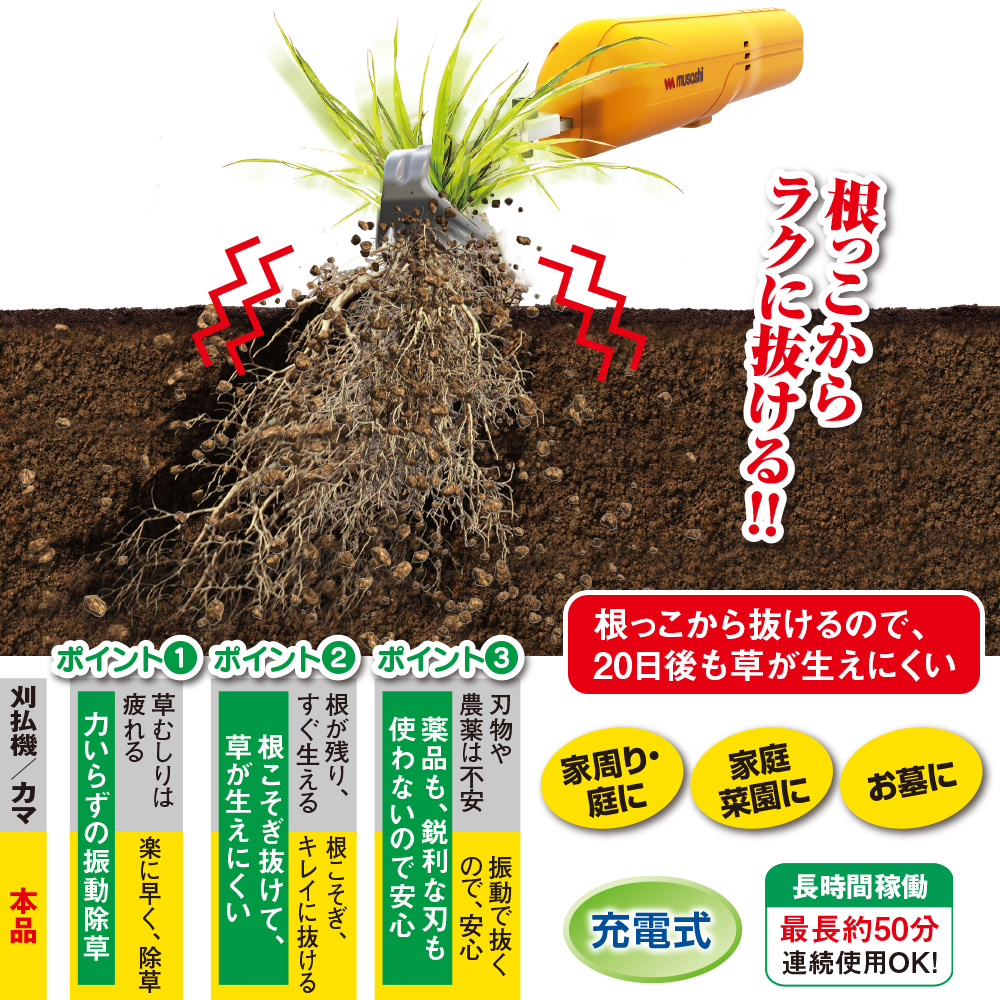 コンパクトなのにパワフル振動で雑草を根こそぎ抜く! 根っこからラクに抜ける! 根っこから抜けるので20日後も草が生えにくい! 薬品も鋭利な刃も使わず、振動で抜くので安心! 軽量約550g!片手で持てるハンドル形状で扱いやすい。 【充電式】最長約50分連続使用OK! お庭・玄関周りに/家庭菜園に/お墓に