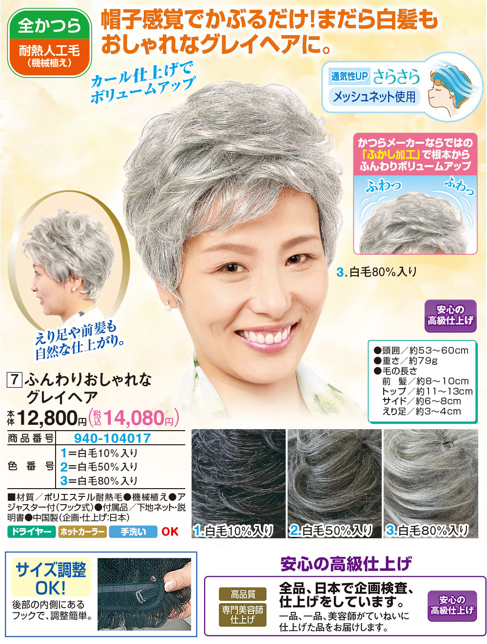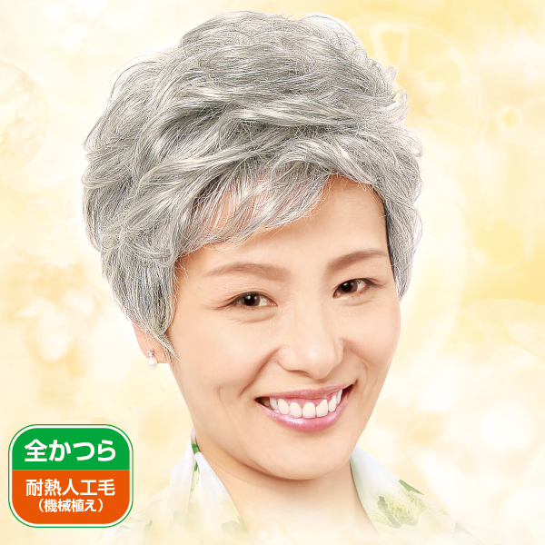 ◎かつらメーカーならではの「ふかし加工」で根本からふんわりボリュームアップ ◎通気性UPメッシュネット使用 ◎えり足や前髪も自然な仕上がり ◎帽子感覚でかぶるだけ!まだら白髪もおしゃれなグレイヘアに ◎全かつら耐熱人工毛 ◎カール仕上げでボリュームアップ