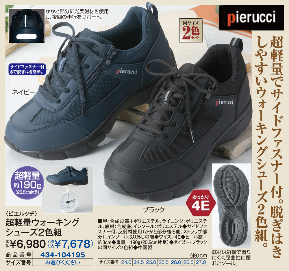 超軽量でサイドファスナー付。脱ぎはきしやすいウォーキングシューズ2色組。 かかと部分に光反射材を使用し、夜間の歩行をサポート。 底材は軽量で滑りにくく屈曲性に優れたソール。 サイドファスナー付きで脱ぎはき簡単。 超軽量:約190g(25.5cm片足) ゆったり4E