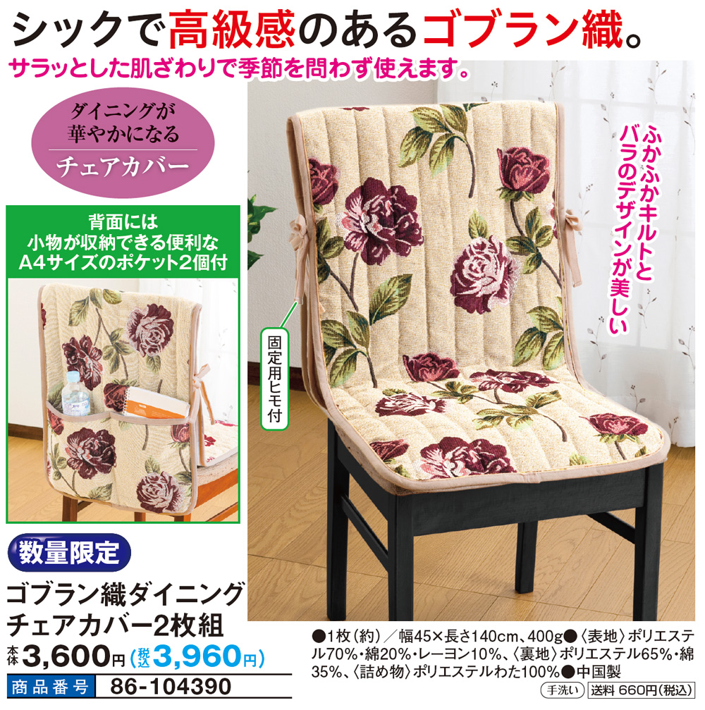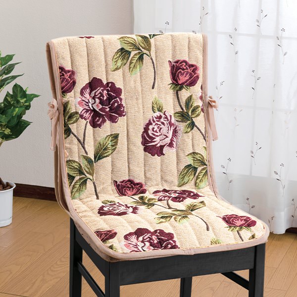 シックで高級感のあるゴブラン織! サラッとした肌ざわりで季節を問わず使えます。 ダイニングが華やかになるチェアカバー! ふかふかキルトとバラのデザインが美しい! 背面には小物が収納できる便利なA4サイズのポケット2個付 ・固定用ヒモ付
