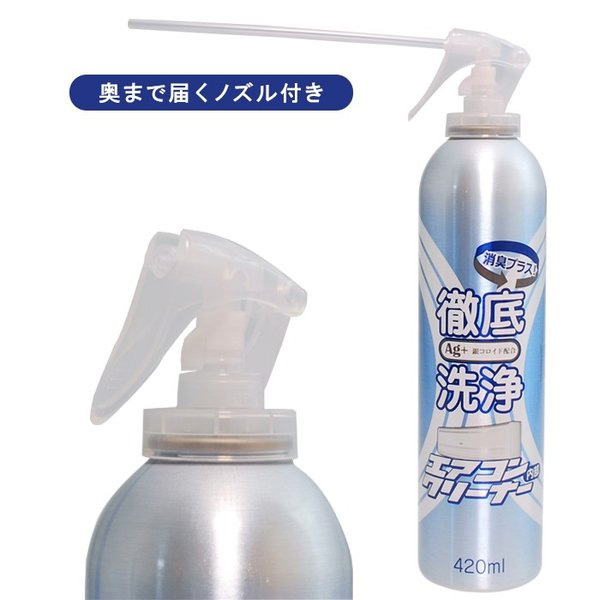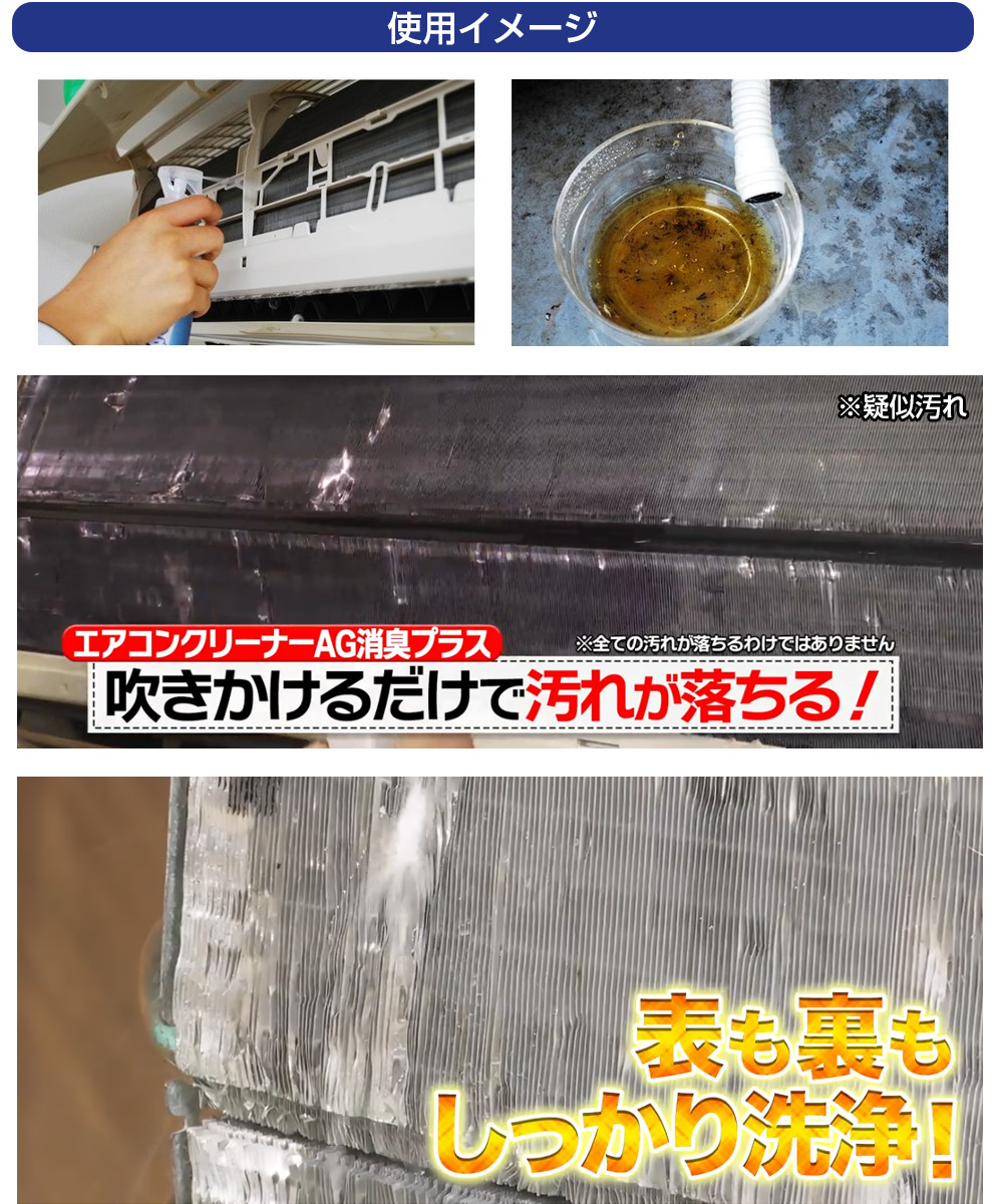 ご自身で手軽にエアコンのお掃除ができます! エアコンフィルターを取った奥側にほこりやカビなどが溜まることで、ニオイの元になります。 エアコンクリーナーAg消臭プラスを吹き掛けていただけば、汚れが落ちていきます!(※全ての汚れが落ちるわけではありません) ・頑固な汚れをスッキリ落とし、抗菌効果や消臭効果もあります! ・水由来の「電解アルカリ水」使用で安心安全!界面活性剤や酸、リン、香料、石油系なども入っていないので、エアコンにも人にもやさしい商品です。 ・エアコンは部屋の空気を吸い込む場所です。中にこもる嫌な臭いを消せば、エアコンの汚れを落とす洗浄効果と合わせて、よりきれいで臭いの少ない空気でお部屋を冷やせるようになります。 ・喫煙者がいるご家庭にもおすすめ。