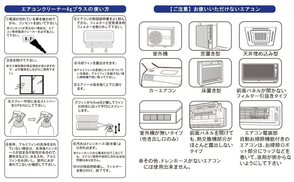 ※室外機、窓置き型、天井埋込み型、室外機がないタイプ、前面パネルを開けても熱交換器部分がほとんど露出していないタイプ、エアコン電装部、カーエアコン、床置き型、ドレンホースがないエアコンにはご使用できません。 ※自動清掃機能付きのエアコンは、お掃除ロボット部分にラップなどを巻いて液剤がかからないようにしてください。 ※パッケージフィルム開封後の交換・返品は、弊社の規定によりお受けしておりませんので、予めご了承ください。