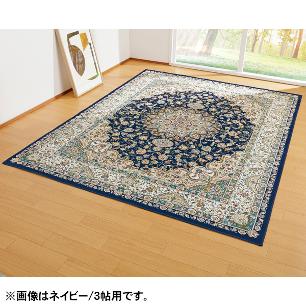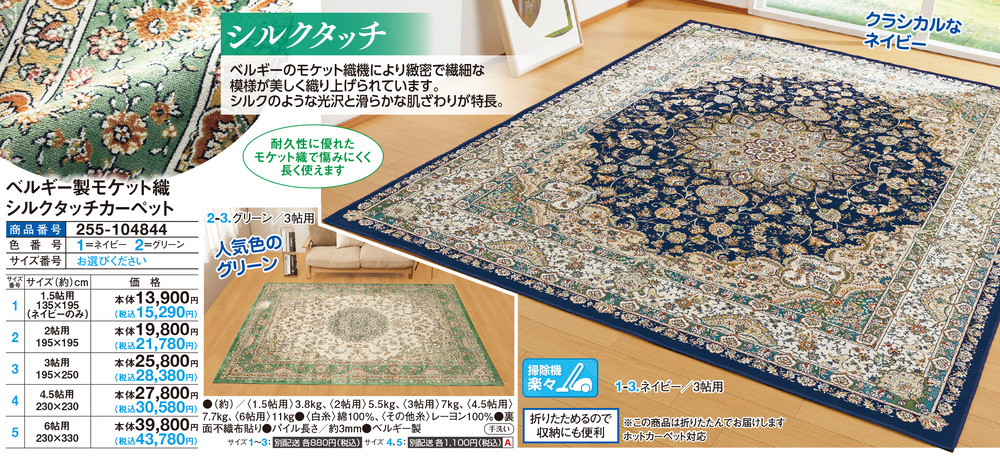 シルクタッチ! ベルギーのモケット織機により緻密で繊細な模様が美しく織り上げられています。 シルクのような光沢と滑らかな肌ざわりが特長。 去年のジメジメ、今年は解消!快適素材のカーペット! ●クラシカルなネイビー ●人気色のグリーン 耐久性に優れたモケット織で傷みにくく長く使えます ●掃除機楽々 ●折りたためるので収納にも便利 ●ホットカーペット対応