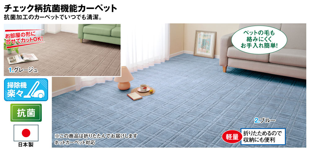 抗菌加工のカーペットでいつでも清潔! お部屋の形に合せてカットOK! ペットの毛も絡みにくくお手入れ簡単! 【軽量】折りたためるので収納にも便利 ●掃除機楽々 ●抗菌