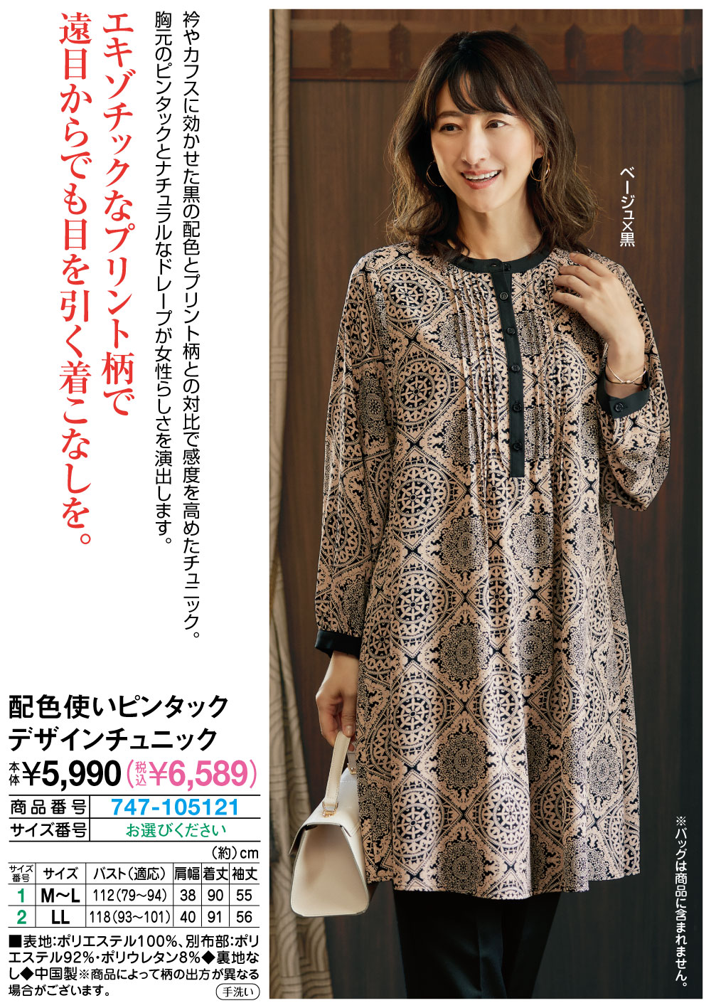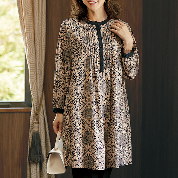 衿やカフスに効かせた黒の配色とプリント柄との対比で感度を高めたチュニック。胸元のピンタックとナチュラルなドレープが女性らしさを演出します。