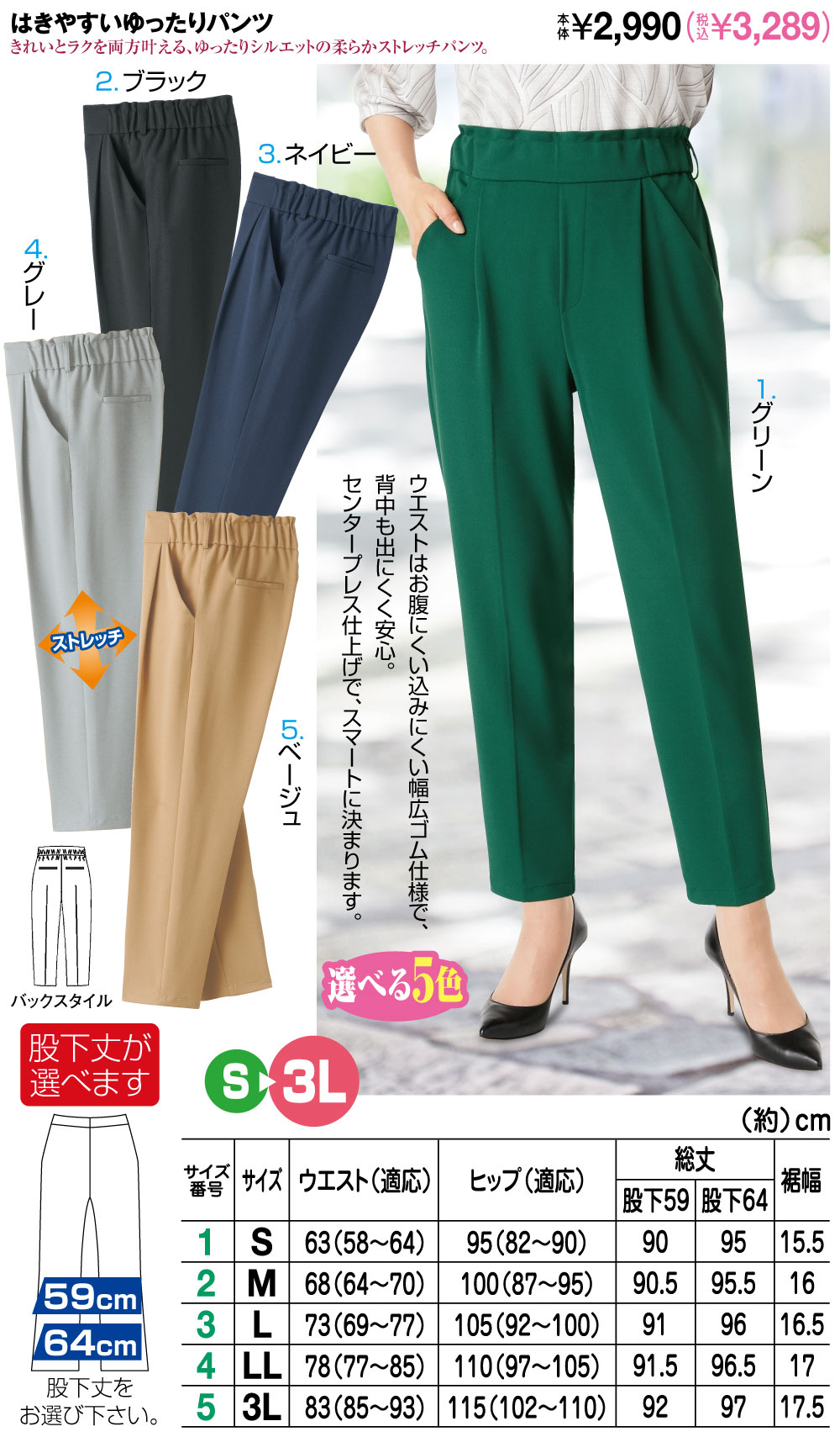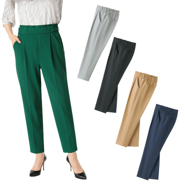 ウエストはお腹にくい込みにくい幅広ゴム仕様で、背中も出にくく安心。センタープレス仕上げで、スマートに決まります。