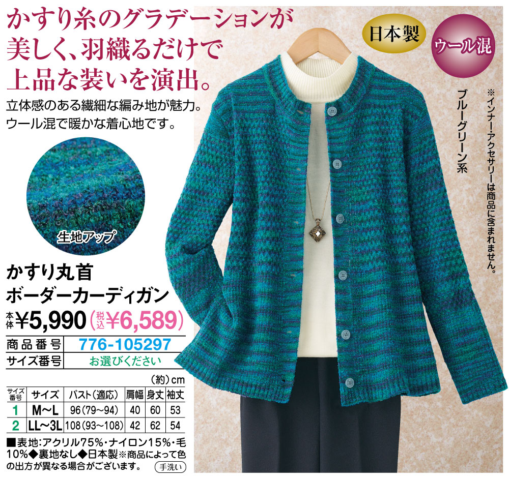 【サイズ(約)】 バスト(適応)、肩幅、身丈、袖丈 <M~L>96(79~94)cm、40cm、60cm、53cm <LL~3L>108(93~108)cm、42cm、62cm、54cm ■表地:アクリル75%・ナイロン15%・毛10% ◆裏地なし ◆日本製