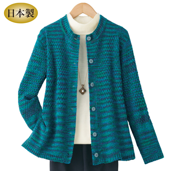 かすり糸のグラデーションが美しく、羽織るだけで上品な装いを演出! 立体感のある繊細な編み地が魅力。 ウール混で暖かな着心地です。 ●ウール混