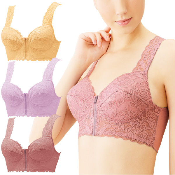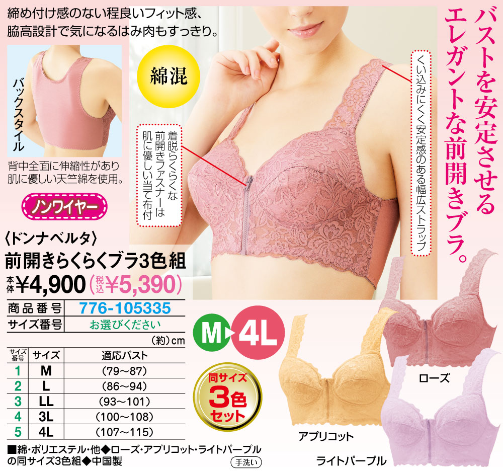 バストを安定させるエレガントな前開きブラ! 締め付け感のない程良いフィット感、脇高設計で気になるはみ肉もすっきり。 くい込みにくく安定感のある幅広ストラップ 着脱らくらくな前開きファスナーは肌に優しい当て布付 背中全面に伸縮性があり肌に優しい天竺綿を使用。 ●ノンワイヤー ●綿混 ●同サイズ3色セット ●M~4L