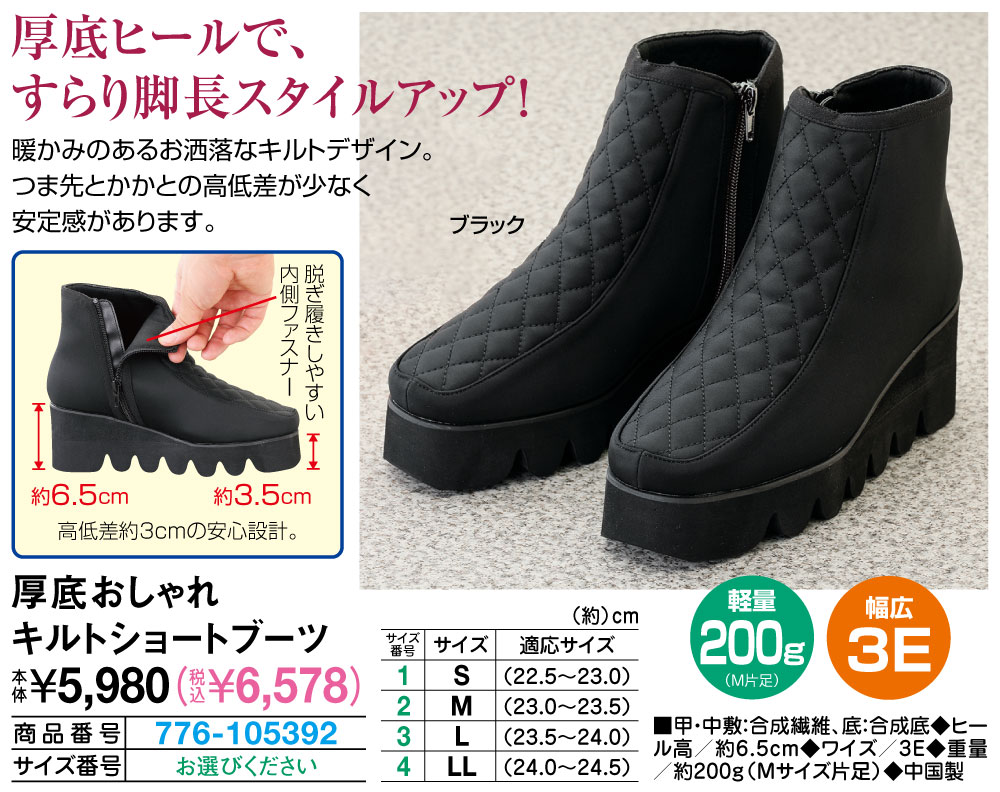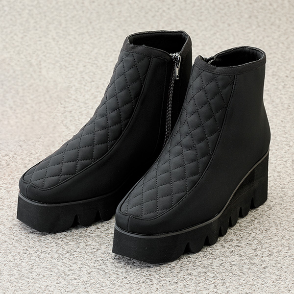 厚底ヒールで、すらり脚長スタイルアップ! 暖かみのあるお洒落なキルトデザイン。 つま先とかかとの高低差が少なく安定感があります。 脱ぎ履きしやすい内側ファスナー 高低差約3cmの安心設計。 ●幅広3E ●軽量200g(M片足)