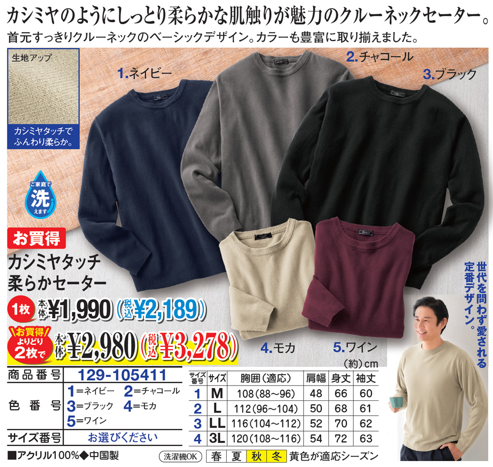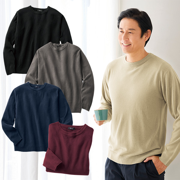 カシミヤのようにしっとり柔らかな肌触りが魅力のクルーネックセーター! 首元すっきりクルーネックのベーシックデザイン。カラーも豊富に取り揃えました。 カシミヤタッチでふんわり柔らか。 世代を問わず愛される定番デザイン。