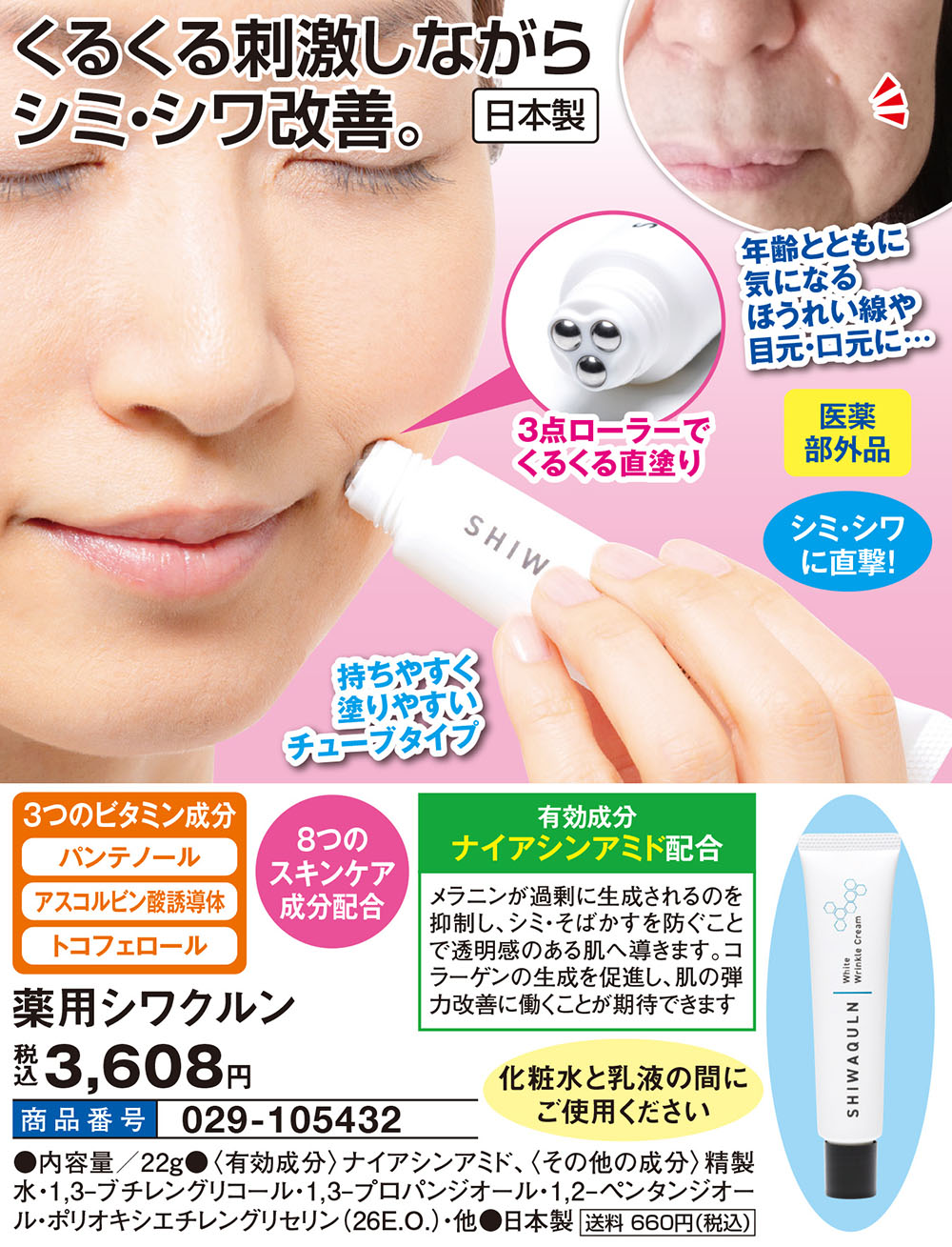 クルクル転がすケアで、やさしくシワ改善!シワ改善&シミ予防のための有効成分・ナイアシンアミドを配合した薬用クリームです。 ●目元や口元など、ハリ不足が気になる部分をトリートメントしながら、角質層にたっぷりのうるおいを与えます。 ●先端が3点ローラーになっていて、手を汚さずにクルクルと塗り広げることができます。 ●医薬部外品 【3つのビタミン成分】 ・パンテノール ・アスコルビン酸誘導体 ・トコフェロール ●8つのスキンケア成分配合 【有効成分ナイアシンアミド配合】 メラニンが過剰に生成されるのを抑制し、シミ・そばかすを防ぐことで透明感のある肌へ導きます。 コラーゲンの生成を促進し、肌の弾力改善に働くことが期待できます。