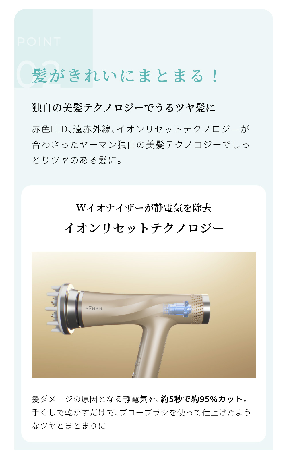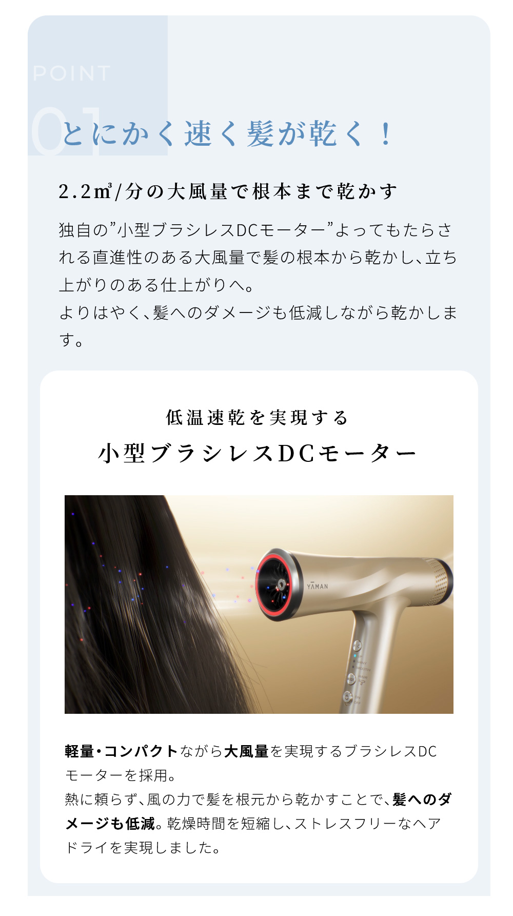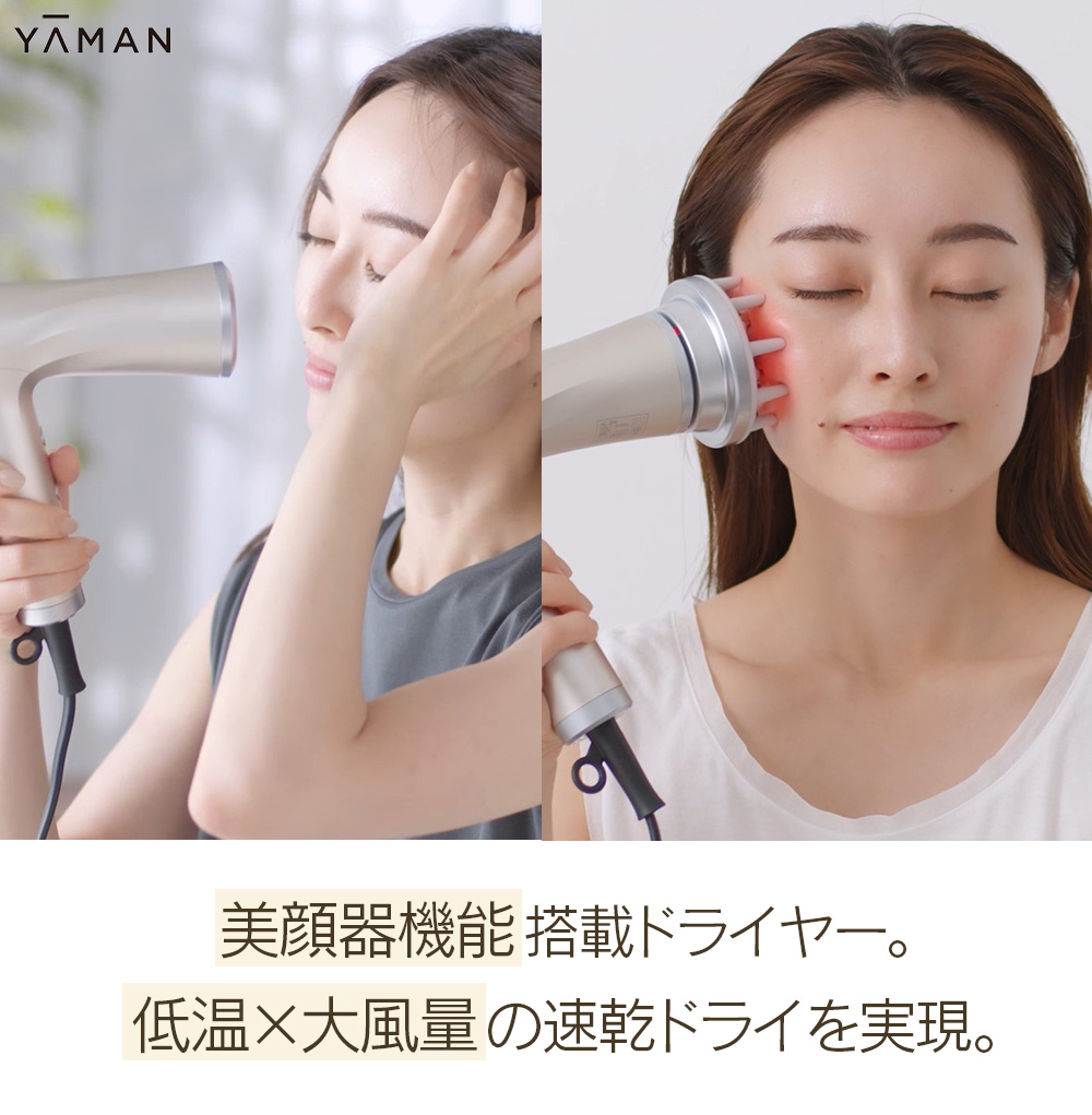 ◎ヤーマン史上初(※1)「美顔器機能」を搭載。 ◎リフトケア(※2)も叶えるドライヤー! ◎ドライヤーのついでにお肌・頭皮ケアもできる! ◎低温×大風量の速乾ドライを実現。 ◎髪を乾かすためだけのドライヤー時間を、顔、頭皮、髪の土台から美しくなるためのリフト(※2)の習慣に。 ※1…フェイスケア用のモード搭載ドライヤーとして ※2…機械で肌を持ち上げること