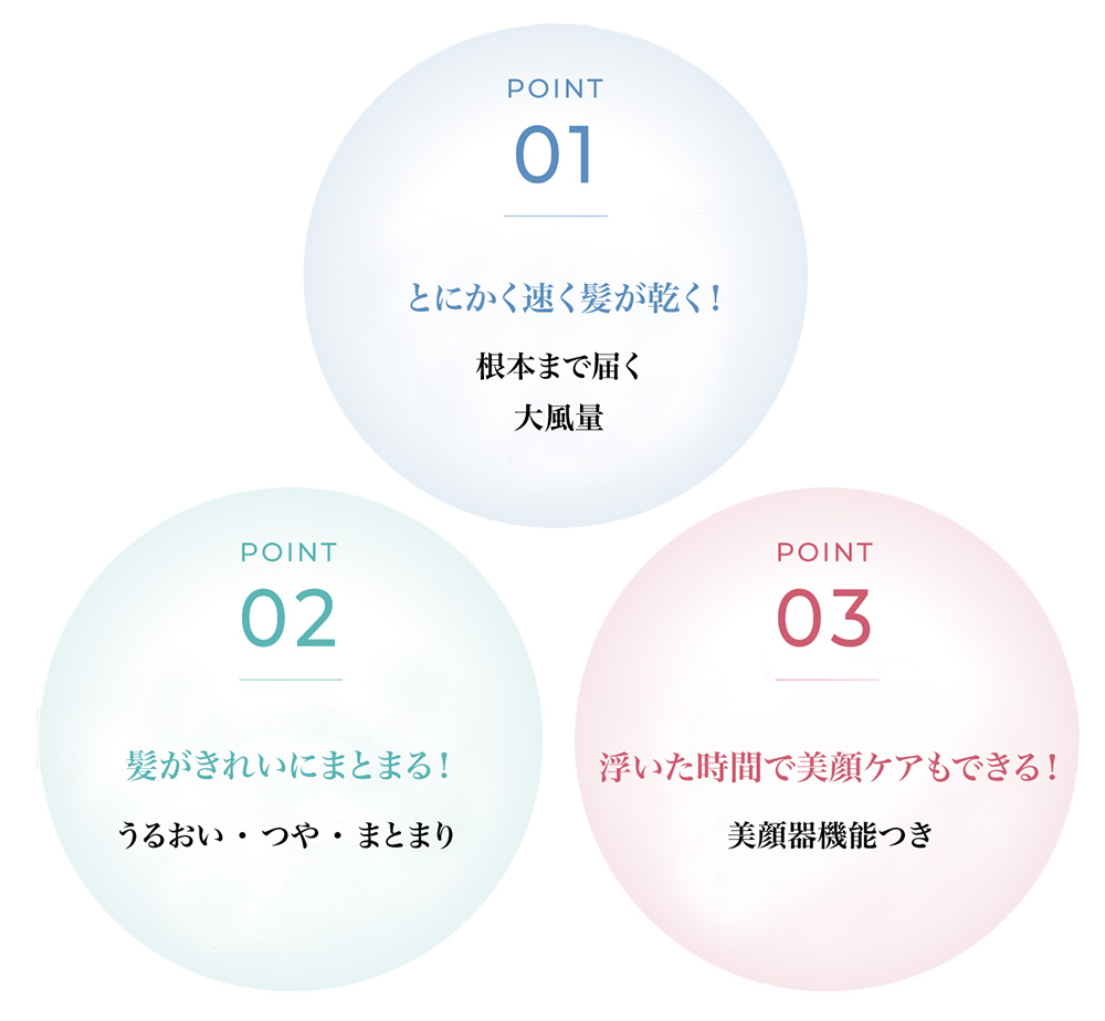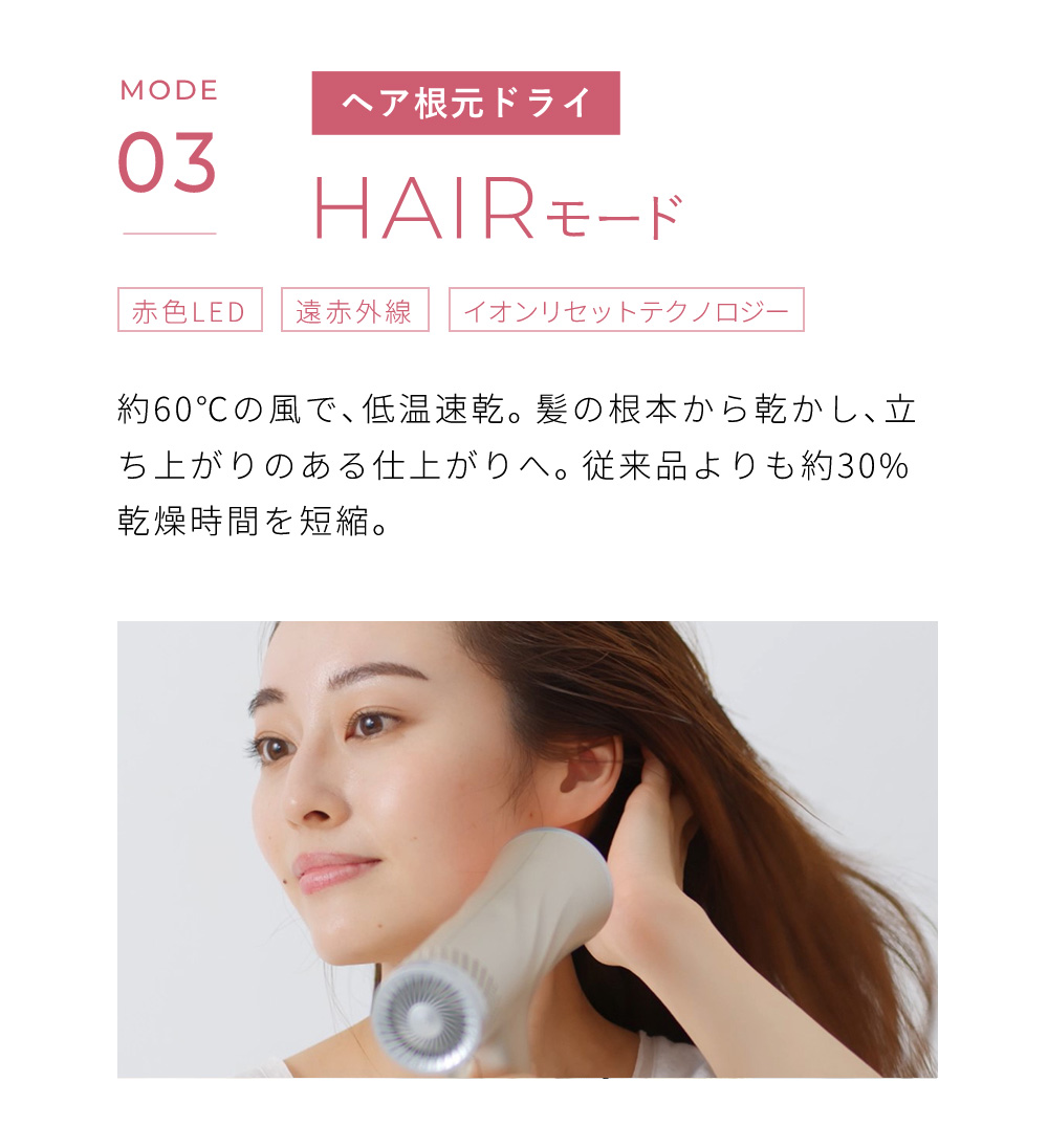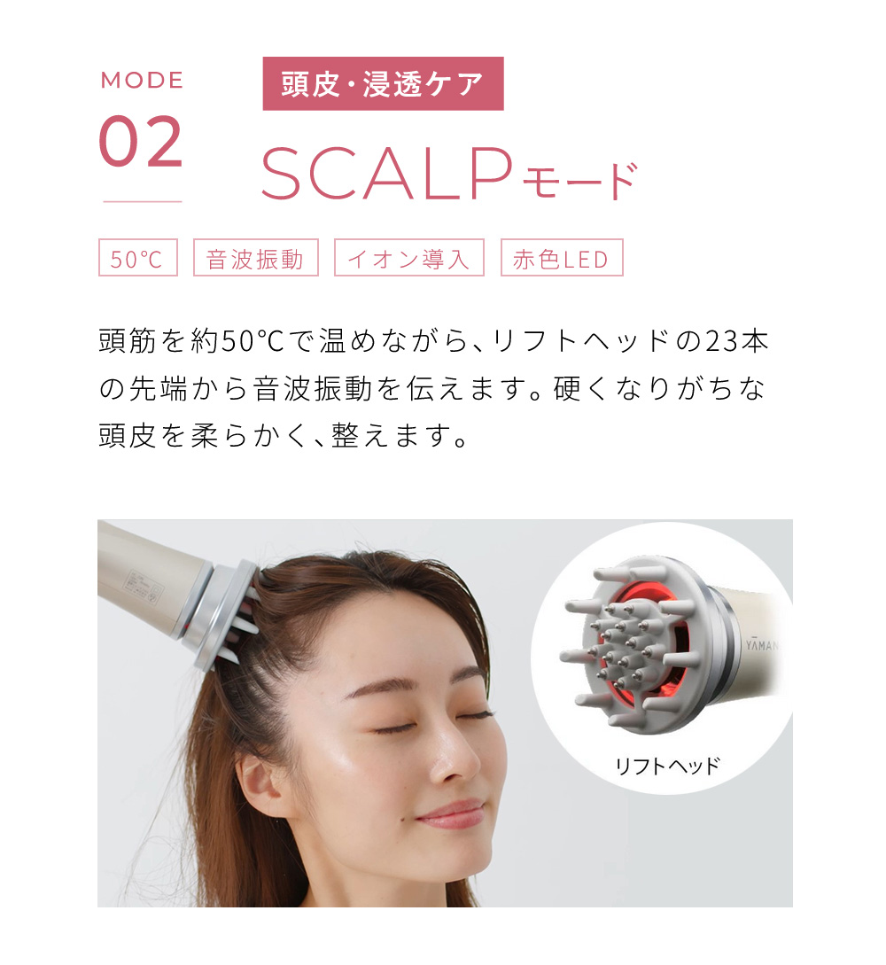 ◎ヤーマン史上初(※1)「美顔器機能」を搭載。 ◎リフトケア(※2)も叶えるドライヤー! ◎ドライヤーのついでにお肌・頭皮ケアもできる! ◎低温×大風量の速乾ドライを実現。 ◎髪を乾かすためだけのドライヤー時間を、顔、頭皮、髪の土台から美しくなるためのリフト(※2)の習慣に。 ※1…フェイスケア用のモード搭載ドライヤーとして ※2…機械で肌を持ち上げること
