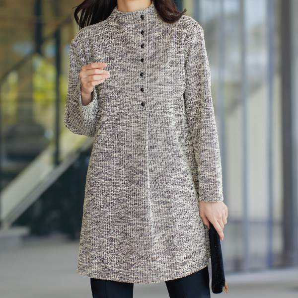 シックでやわらかな風合いのチュニック! ラメ入りのツィード素材でエレガントな装いに。 ボトルネックから縦ラインに施したボタンとタック使いでスマート見えします。 ●綿混