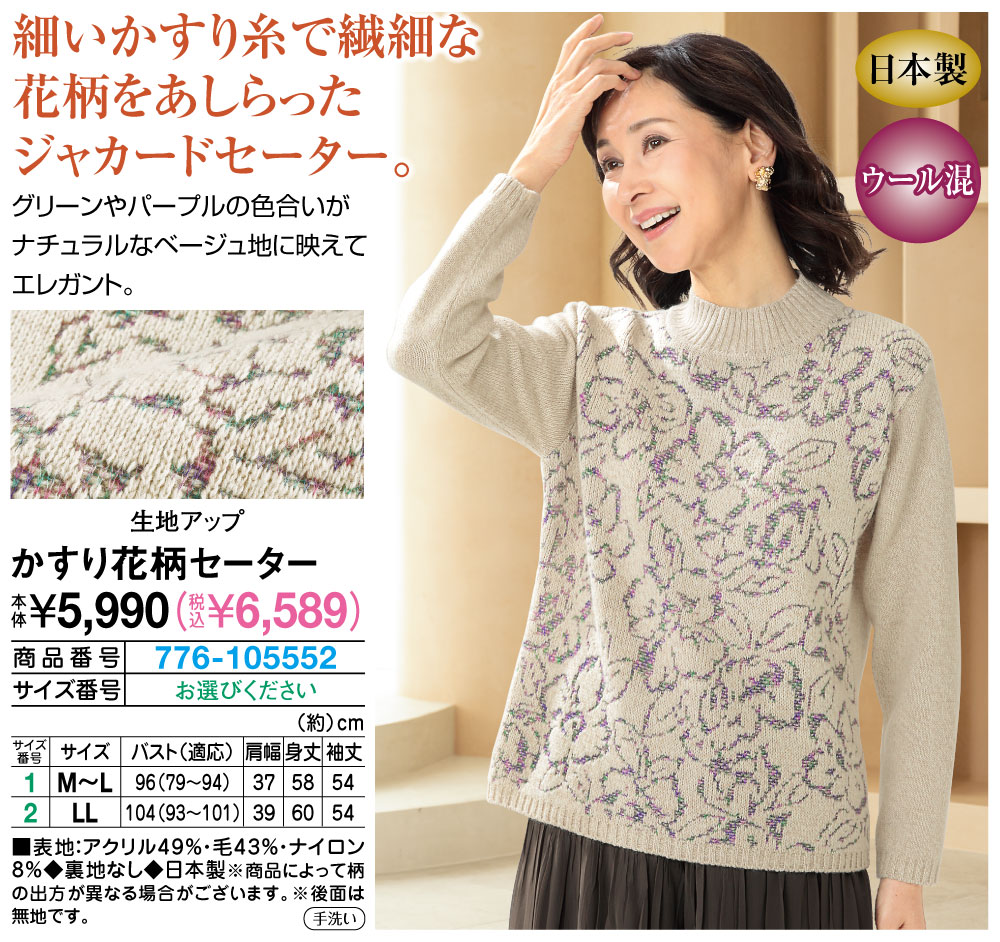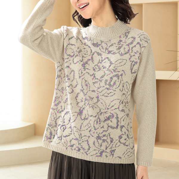 細いかすり糸で繊細な花柄をあしらったジャカードセーター! グリーンやパープルの色合いがナチュラルなベージュ地に映えてエレガント。 ●ウール混
