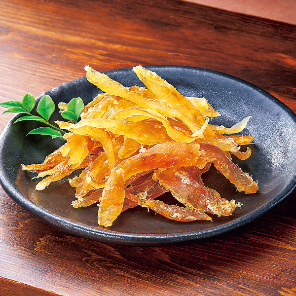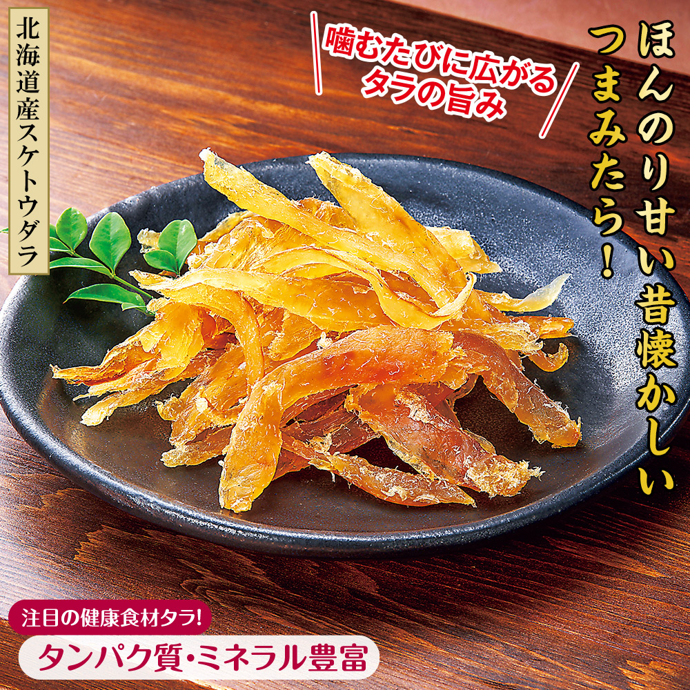 【北海道産スケトウダラ】 噛むたびに広がるタラの旨み。 注目の健康食材タラ! タンパク質・ミネラル豊富 北海道産のスケトウダラを干して一口大にした珍味。 甘さと塩加減のバランスにお酒がすすむ一品です。