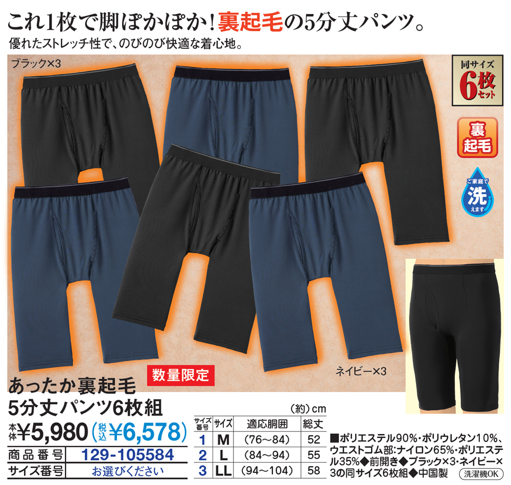 これ1枚で脚ぽかぽか!裏起毛の5分丈パンツ! 優れたストレッチ性で、のびのび快適な着心地。 ●同サイズ6枚セット ●裏起毛