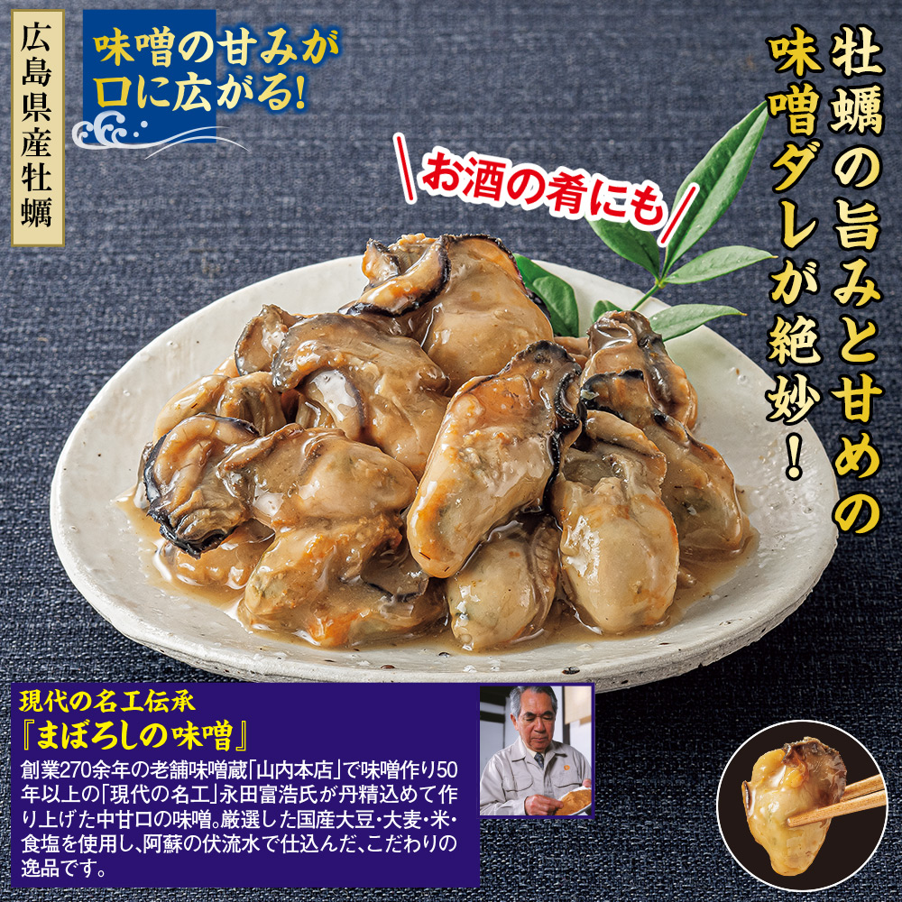 【広島県産牡蠣】 老舗味噌蔵「山内本店」の『まぼろしの味噌』と、熊本の伝統酒『東肥赤酒』を使用した味噌ダレで仕上げた逸品です。 お酒の肴にも。 現代の名工伝承『まぼろしの味噌』 創業270余年の老舗味噌蔵「山内本店」で味噌作り50年以上の「現代の名工」永田富浩氏が丹精込めて作り上げた中甘口の味噌。 厳選した国産大豆・大麦・米・食塩を使用し、阿蘇の伏流水で仕込んだ、こだわりの逸品です。