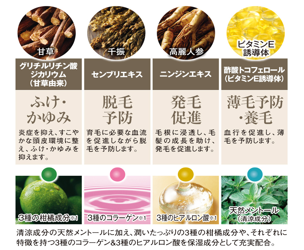 地肌トラブルをケアしながら頭皮を爽快育毛! ◎効能・効果 育毛、薄毛、かゆみ、脱毛の予防、毛生促進、発毛促進、ふけ、病後・産後の脱毛、養毛