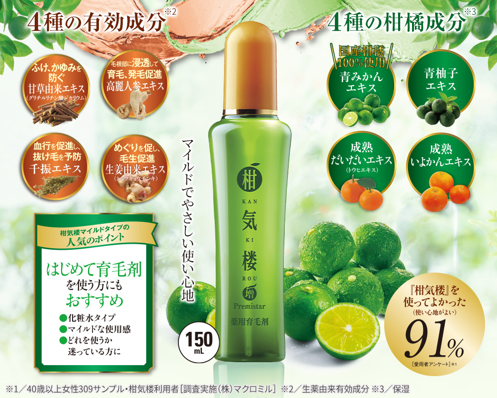 選ばれてご愛用者750万人突破! ※2024年2月現在(薬用育毛剤「柑気楼」シリーズ累計) ◎効能・効果 育毛、薄毛、かゆみ、脱毛の予防、毛生促進、発毛促進、ふけ、病後・産後の脱毛、養毛 ◎医薬部外品
