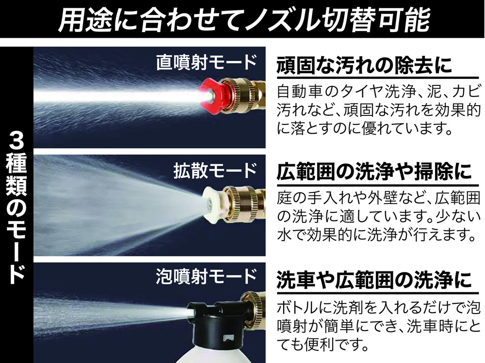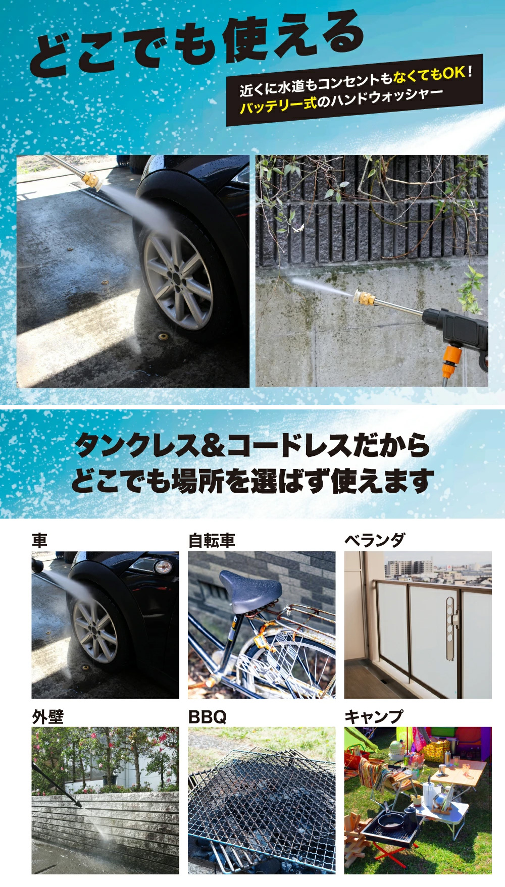 電源コンセント接続不要&タンクレス! 2.5Mpaの強力噴射で頑固な汚れをしっかり取り除く! ◎大容量バッテリー搭載 ◎バケツに貯めた水から給水 汚れに合わせてノズルを変更可能! ・直射ノズル ・泡噴射ノズル ・拡散ノズル