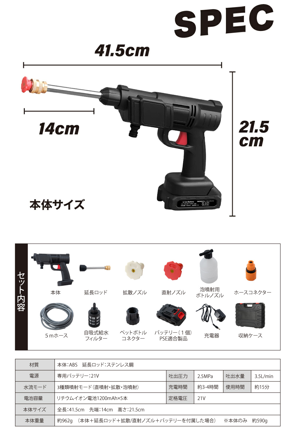 【セット内容】本体、延長ロッド、拡散ノズル、直射ノズル、泡噴射用ボトルノズル、ホースコネクター、5mホース、自吸式給水フィルター、ペットボトルコネクター、バッテリー(1個)、充電器、収納ケース 【本体サイズ(約)】全長41.5×先端14×高さ21.5cm 【重量(約)】962g(本体+延長ロッド+拡散/直噴ノズル+バッテリー装着時)、本体のみ:590g 【材質】本体:ABS、延長ロッド:ステンレス鋼 【吐出圧力】2.5Mpa 【吐出水量】3.5L/min 【水流モード】3種類噴射モード(直噴射・拡散・泡噴射) 【充電時間(約)】3~4時間 【稼働時間(約)】15分 【電池容量】リチウムイオン電池1200mAh×5本 【定格電圧】21V 【ホース長さ(約)】5m 【品番】54588 ●取扱説明書