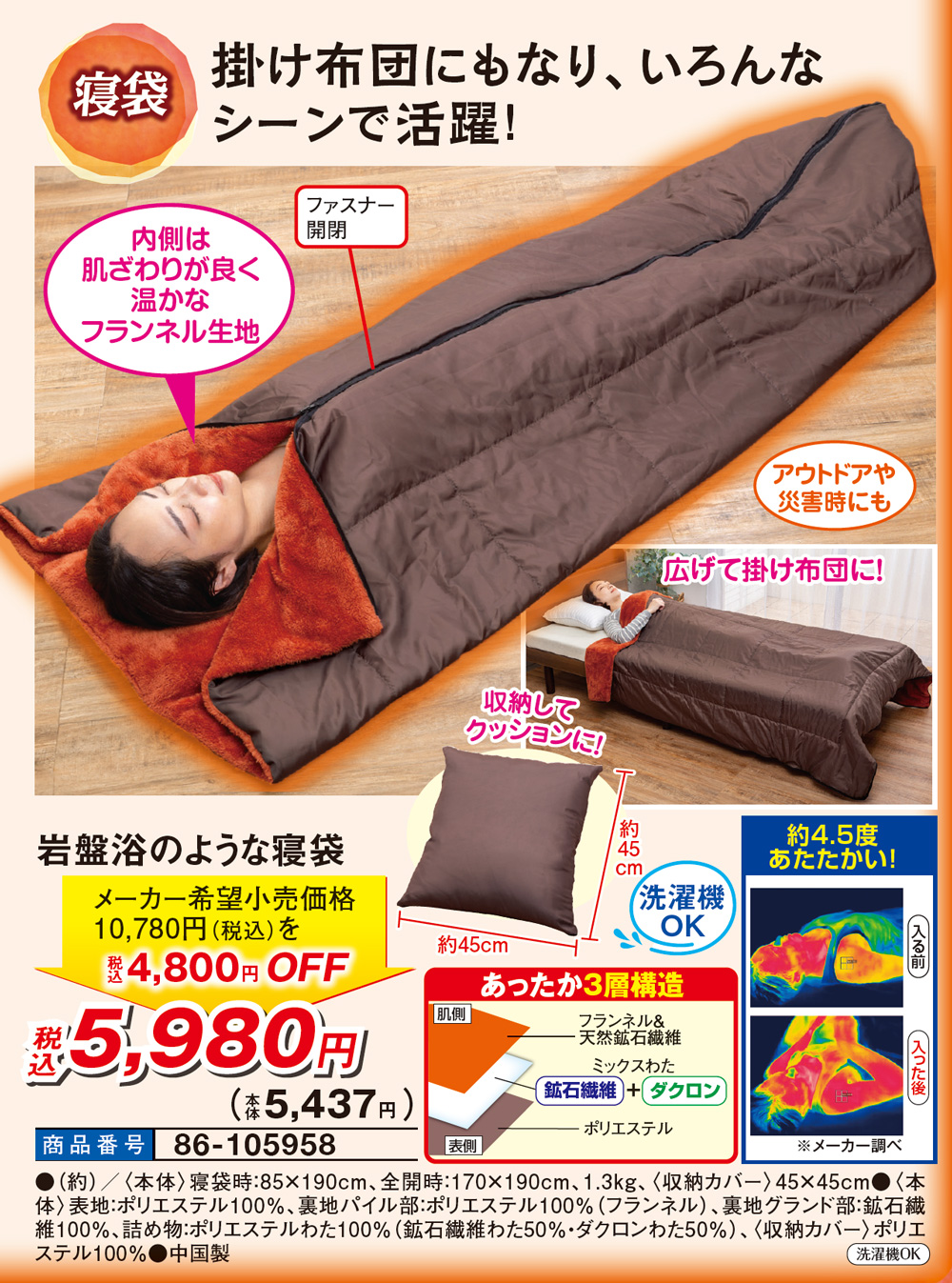 掛け布団にもなり、いろんなシーンで活躍! じんわり温まる鉱石繊維入り 岩盤浴シリーズ まるで岩盤浴のようなあたたかさ! 2つの特殊繊維をミックスした蓄熱わたで体の芯からぽっかぽか! 【鉱石繊維わた】 微量の鉱物質を配合し蓄熱性に優れた長繊維わた + 【ダクロンわた】 優れた弾力性と抗菌防臭性を備えた中空繊維わた ●抗菌 防臭 【寝袋】 内側は肌ざわりが良く温かなフランネル生地 ファスナー開閉 広げて掛け布団に! 収納してクッションに! アウトドアや災害時にも 約4.5度あたたかい! ※メーカー調べ 【あったか3層構造】 フランネル&天然鉱石繊維ミックスわた 鉱石繊維+ダクロン ポリエステル