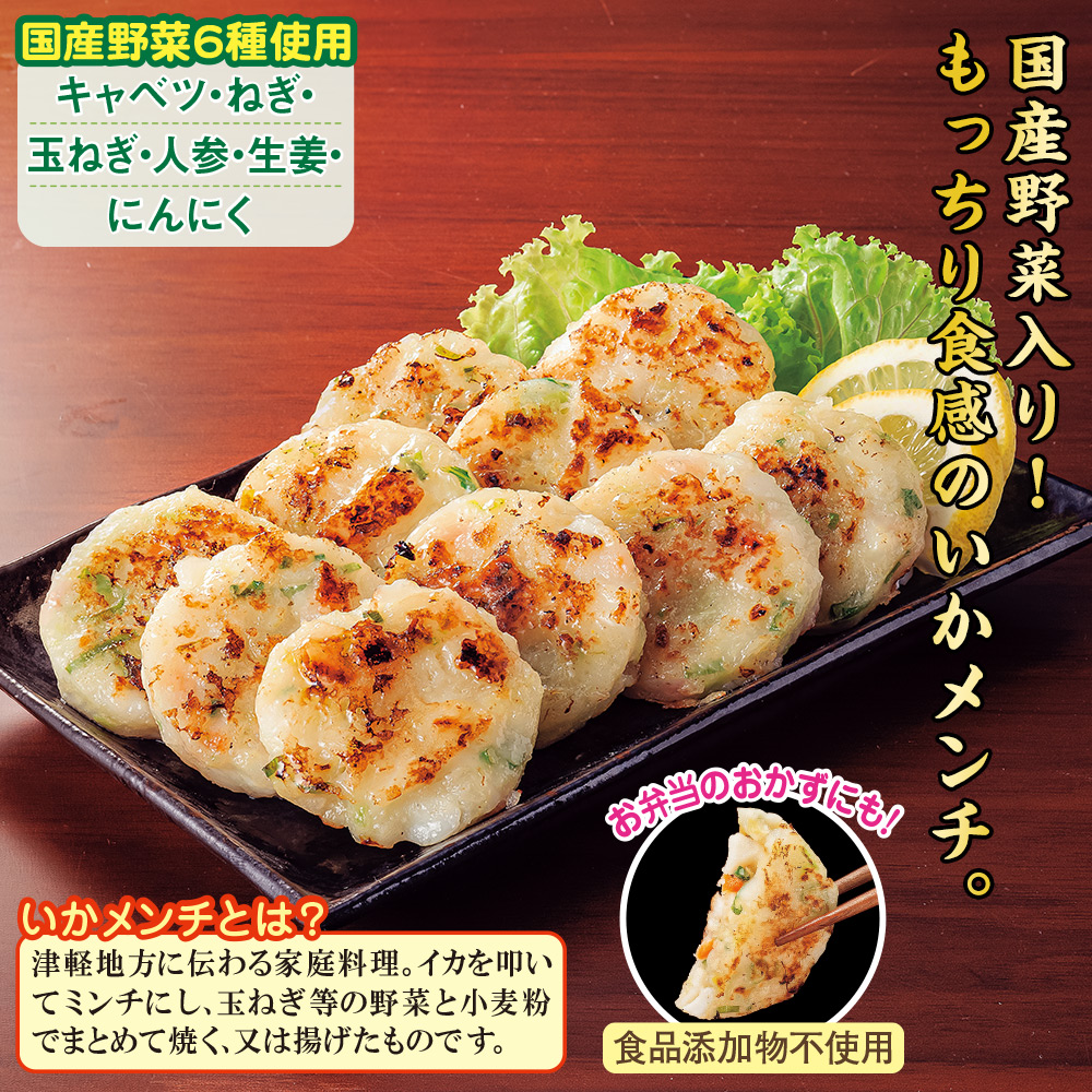 いかとキャベツ等の具材を小さくカットした、ミニサイズのお好み焼き風惣菜です。冷凍状態で焼くだけの簡単調理です。 国産野菜6種使用 キャベツ・ねぎ・玉ねぎ・人参・生姜・にんにく いかメンチとは? 津軽地方に伝わる家庭料理。 イカを叩いてミンチにし、玉ねぎ等の野菜と小麦粉でまとめて焼く、又は揚げたものです。 食品添加物不使用