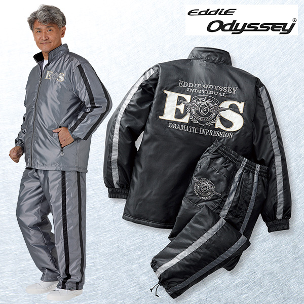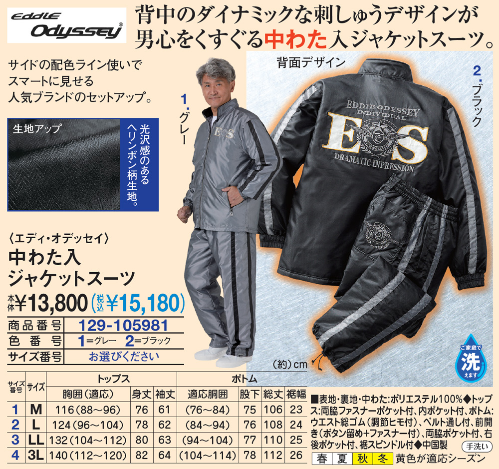 背中のダイナミックな刺しゅうデザインが男心をくすぐる中わた入ジャケットスーツ! サイドの配色ライン使いでスマートに見せる人気ブランドのセットアップ。 ●光沢感のあるヘリンボン柄生地。
