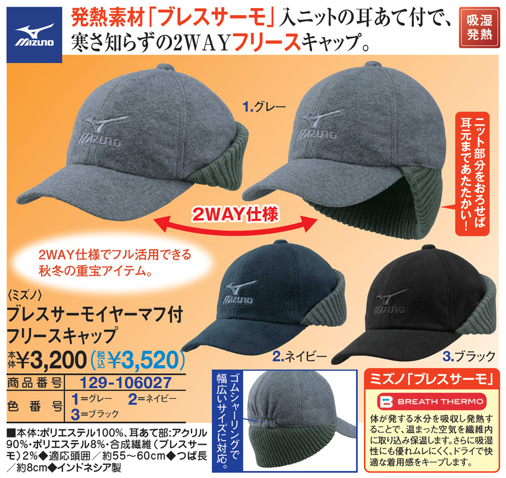 発熱素材「ブレスサーモ」入ニットの耳あて付で、寒さ知らずの2WAYフリースキャップ! 2WAY仕様でフル活用できる秋冬の重宝アイテム。 ニット部分をおろせば耳元まであたたかい! 2WAY仕様 ゴムシャーリングで幅広いサイズに対応。 【ミズノ「ブレスサーモ」】 体が発する水分を吸収し発熱することで、温まった空気を繊維内に取り込み保温します。さらに吸湿性にも優れムレにくく、ドライで快適な着用感をキープします。 ●吸湿発熱