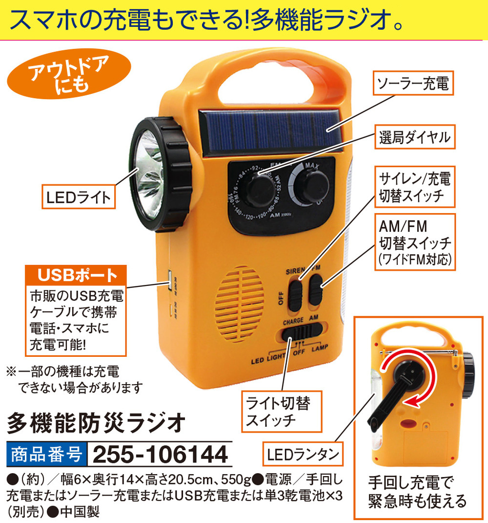 ●(約)/幅6×奥行14×高さ20.5cm、550g ●電源/手回し充電またはソーラー充電またはUSB充電または単3乾電池×3(別売) ●中国製