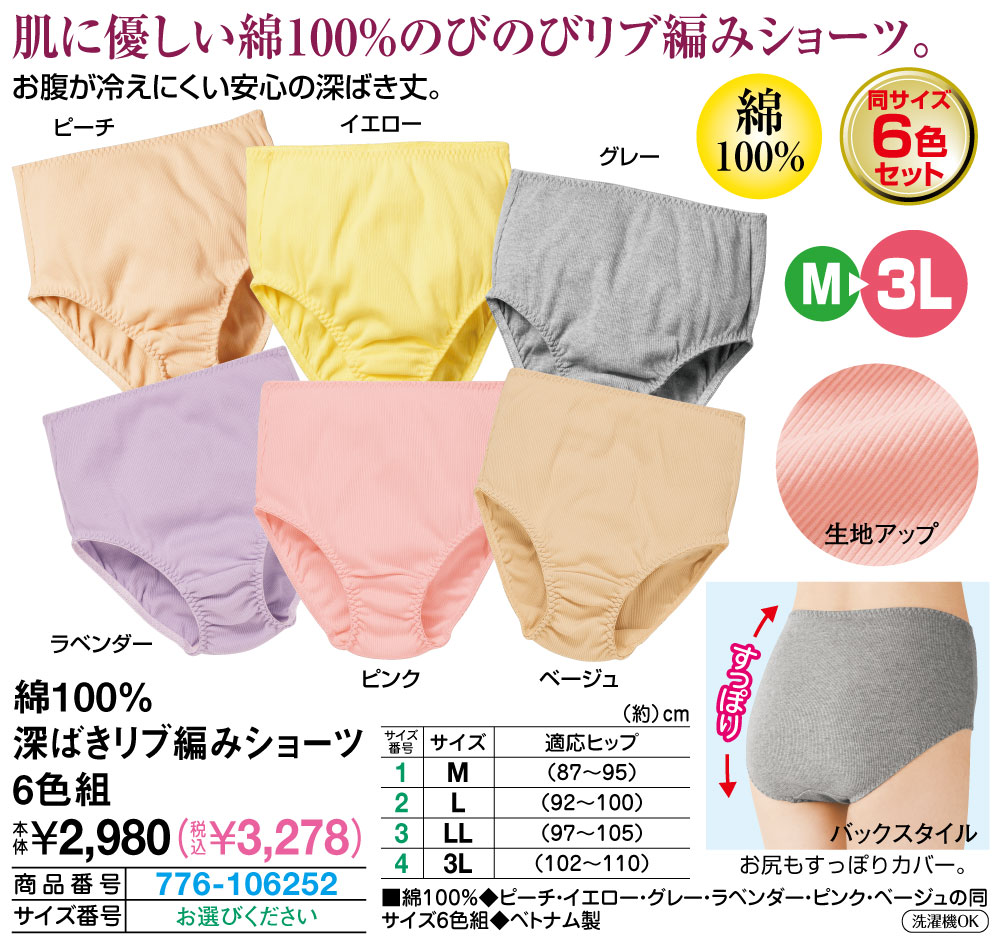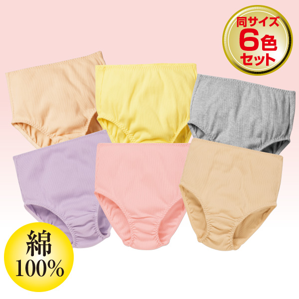 【サイズ(約)】 適応ヒップ <M>(87~95)cm <L>(92~100)cm <LL>(97~105)cm <3L>(102~110)cm ■綿100% ◆ピーチ・イエロー・グレー・ラベンダー・ピンク・ベージュの同サイズ6色組 ◆ベトナム製