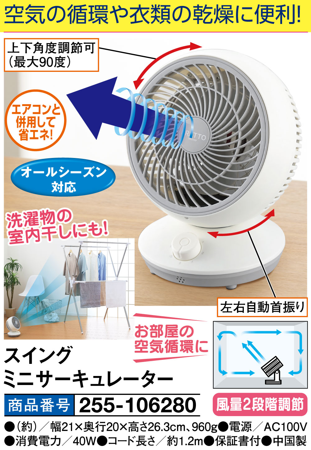 空気を循環させて暖房効率アップ!衣類の乾燥にも便利! 洗濯物の室内干しにも! お部屋の空気循環に エアコンと併用して省エネ! 左右自動首振り 上下角度調節可(最大90度) ●オールシーズン対応 ●風量2段階調節