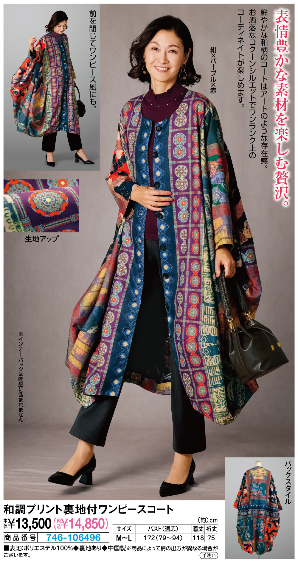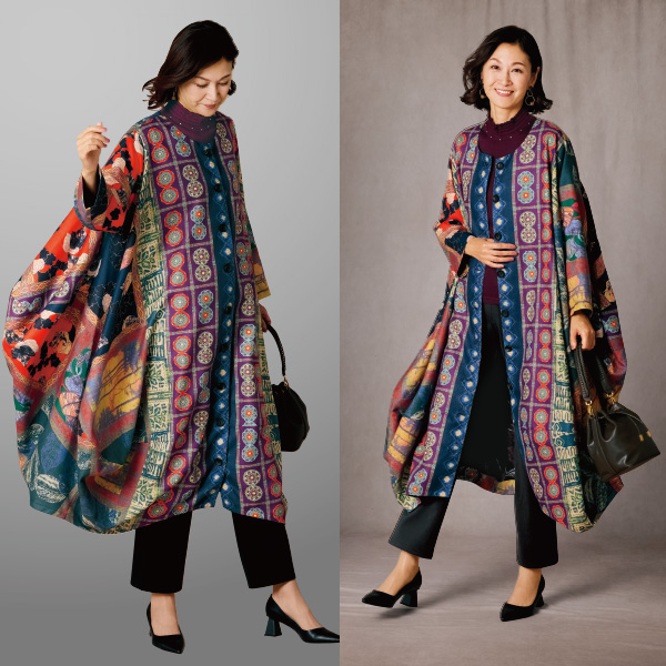 表情豊かな素材を楽しむ贅沢! 鮮やかな和柄のコートはアートのような存在感。 お洒落なコクーンシルエットでワンランク上のコーディネイトが楽しめます。 前を閉じてワンピース風にも。