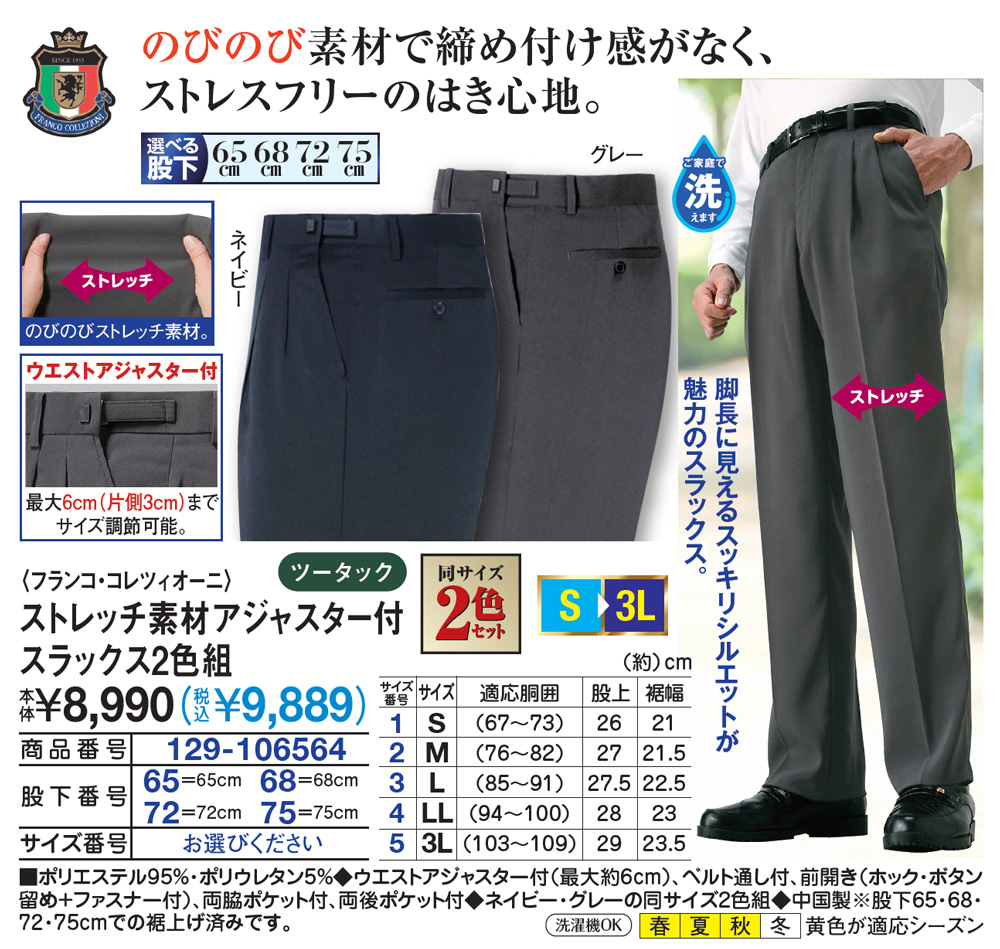 のびのび素材で締め付け感がなく、ストレスフリーのはき心地! 脚長に見えるスッキリシルエットが魅力のスラックス。 のびのびストレッチ素材。 【ウエストアジャスター付】 最大6cm(片側3cm)までサイズ調節可能。 ●ツータック ●ストレッチ ●同サイズ2色セット ●選べる股下65cm・68cm・72cm・75cm ●S~3L