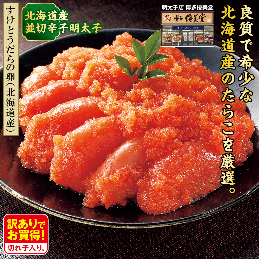 【すけとうだらの卵(北海道産)】 北海道産並切辛子明太子 希少な北海道産たらこを48時間以上熟成しました。北海道産昆布のタレを使用。 訳ありでお買得! 切れ子入り。