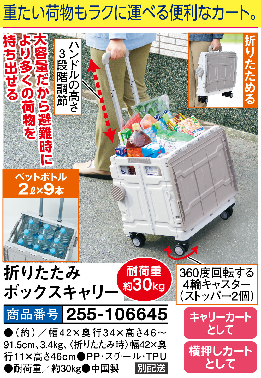 買い物やレジャーに使える便利なカート! 大きな物も重たい荷物もラクラク運べる♪ フタの上にも荷物を置ける ハンドル側に小物を収納できるポケット付き ・360度回転する4輪キャスター(ストッパー2個) ・耐荷重約30kg \たっぷり入る/ ペットボトル2L×9本 ・キャリーカートとして買い物に ・横押しカートとしてレジャーに 車にそのまま積める コンパクトに折りたためて持ち運びに便利 ・ハンドルの高さ3段階調節 ・フタ付