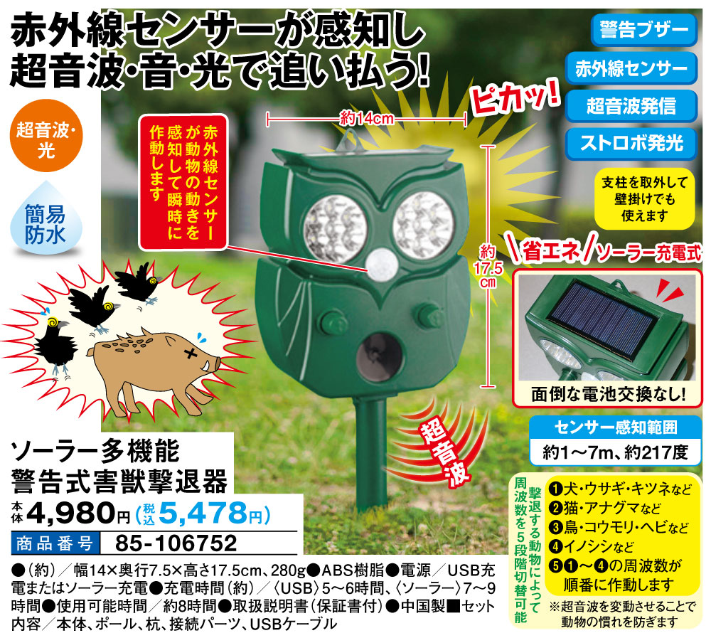 赤外線センサーが感知し超音波・音・光で追い払う! 赤外線センサーが動物の動きを感知して瞬時に作動します 支柱を取外して壁掛けでも使えます 【省エネ!ソーラー充電式】 面倒な電池交換なし! 【センサー感知範囲】 約1~7m、約217度 【撃退する動物によって周波数を5段階切替可能】 (1)犬・ウサギ・キツネなど (2)猫・アナグマなど (3)鳥・コウモリ・ヘビなど (4)イノシシなど (5)(1)~(4)の周波数が順番に作動します ※超音波を変動させることで動物の慣れを防ぎます ●警告ブザー ●赤外線センサー ●超音波発信 ●ストロボ発光 ●超音波・光 ●簡易防水