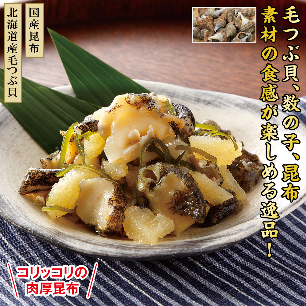 【北海道産毛つぶ貝】【国産昆布】 コリッコリの肉厚昆布。 毛つぶ貝、数の子、昆布素材の食感が楽しめる逸品!